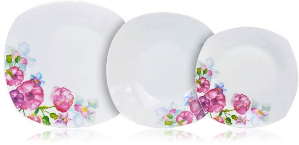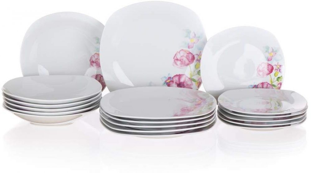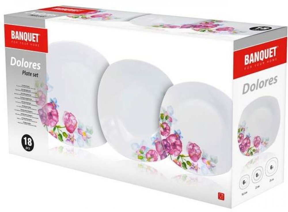 Porcelánová sada talířů DOLORES vás zaujme romantickým dekorem květin. Talířová sada se skládá z 6 ks mělkých talířů, 6 ks hlubokých talířů a 6 ks dezertních talířů. Vhodné do mikrovlnné trouby a do myčky nádobí pouze na jemný program.