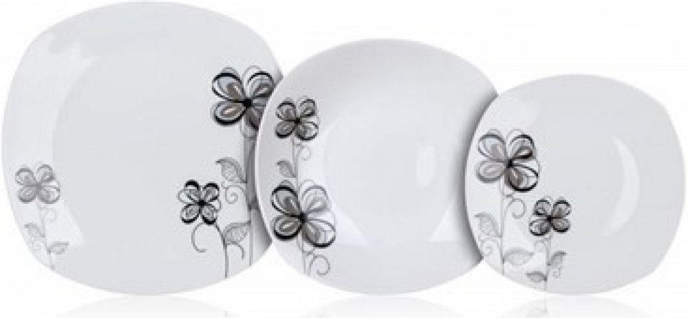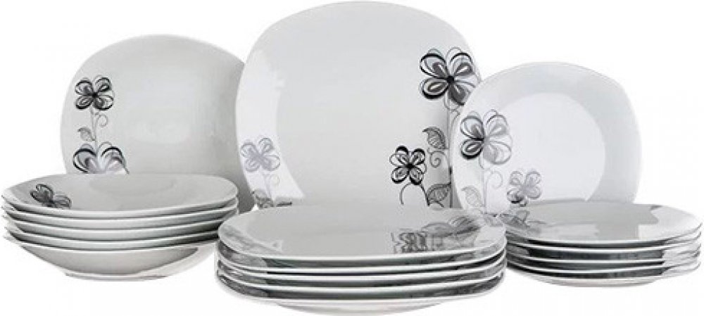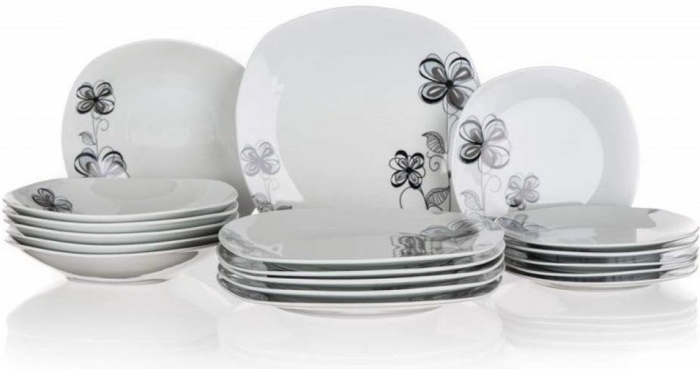 Elegantní jídelní sada s čtvercovým tvarem talířů je vyrobena z kvalitního porcelánu a dekorovaná pěkným květinovým motivem, který krásně vyniká na čistě bílém podkladu. Porcelán zajistí nádobí pevnost, lesk, hladký povrch a pěkný vzhled po dlouhou bodu. Sada je vhodná pro každodenní používání, mytí v myčce i ohřívání v mikrovlnné troubě. Sada obsahuje: