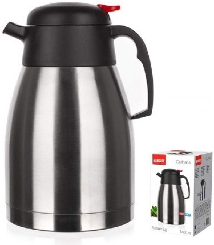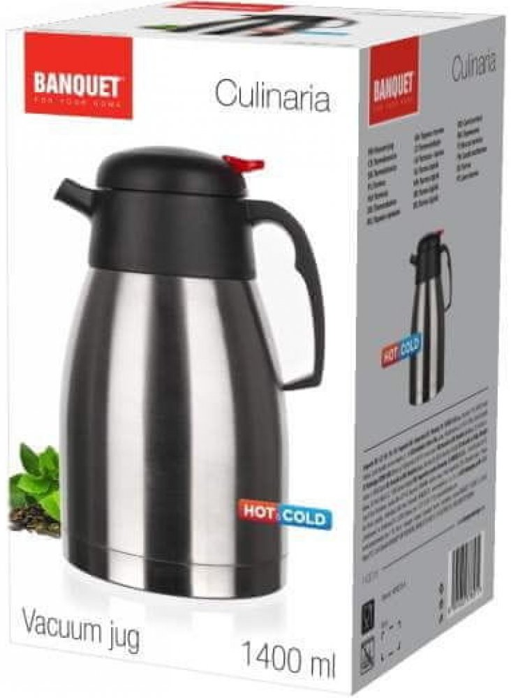 Termoska je vybavena bezpečnostním uzávěrem, který po stisknutí umožní nalévání tekutiny. Banquet Termoska nerezová Akcent 1,4 l má výborné izolační vlastnosti jak pro nápoj teplý, tak i studený. Před samotným naplněním zvoleného nápoje doporučujeme nejdříve termosku naplnit vodou studenou nebo horkou podle vámi požadované teploty vlastního nápoje. Zvýšíte tím účinnost a dlouhodobost teploty v termosce. Termoska má tvar džbánu a je opatřena plastovým uchem, které perfektně padne do ruky a nepálí.