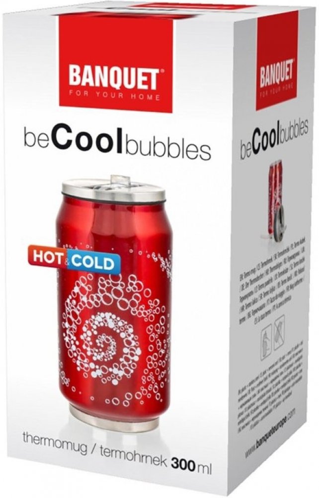Originální termoska ve tvaru plechovky s hezký dekorem bublinek na červeném podkladu. Jedná se o moderní provedení, které vystupuje proti tradičnímu tvaru termosek. Součástí termosky je praktické pítko a brčko, takže pití je opravdu pohodlné. Termoska má dvoustěnné tělo, uvnitř je nerez ocel 18/8, vně 18/0. Víčko je z nerezu 201. Banquet Termoska beCool Bubbles 300 ml udrží až 12 hodin teplou a 6 ...