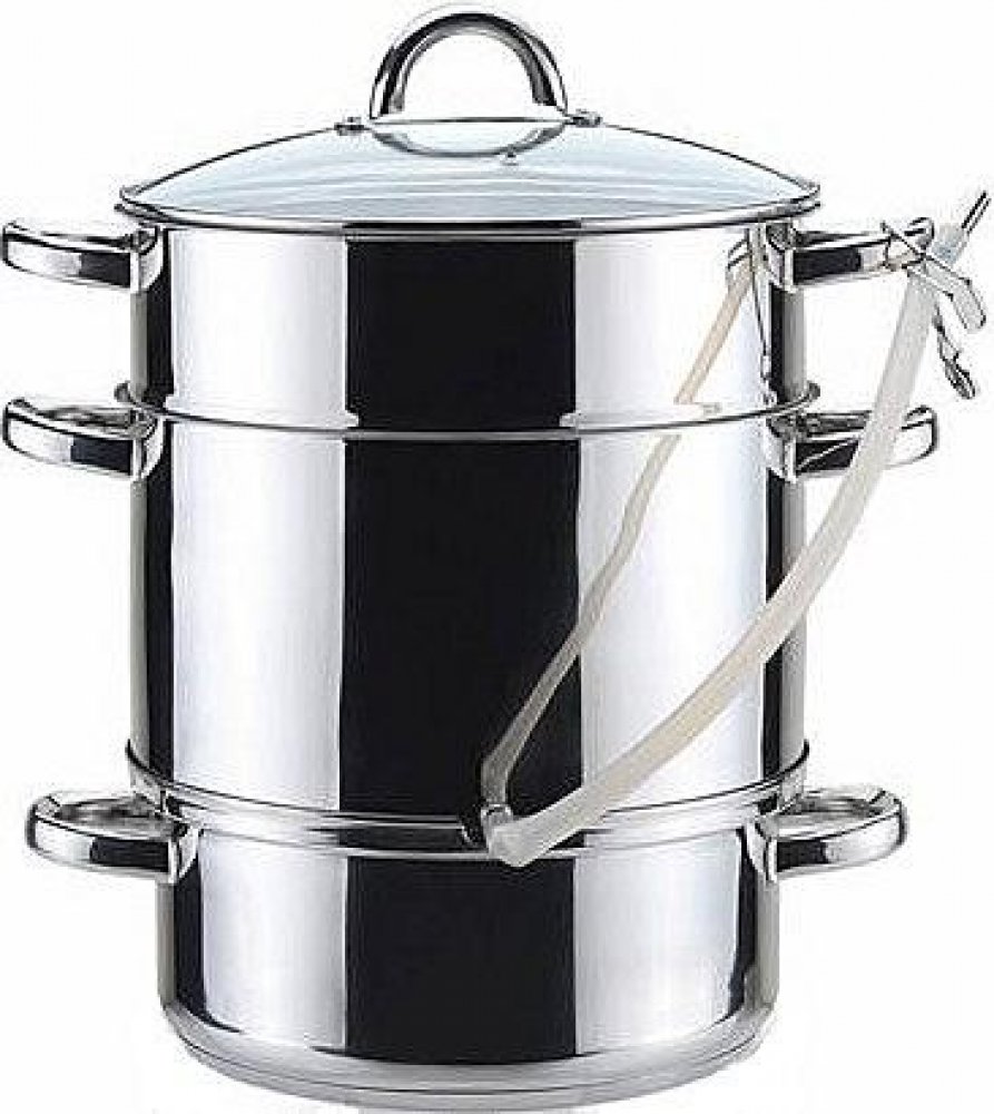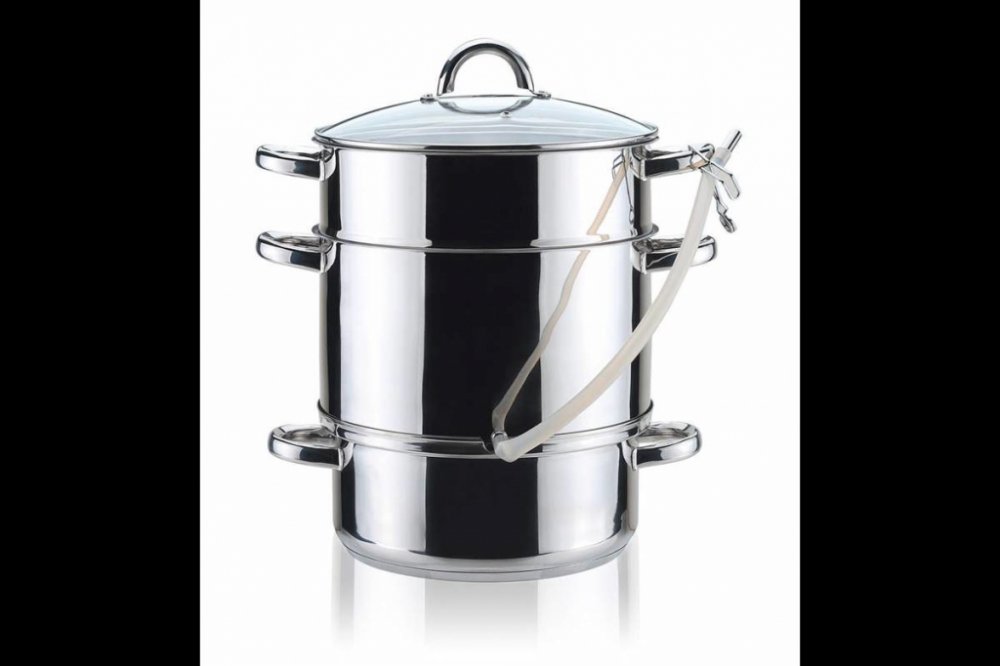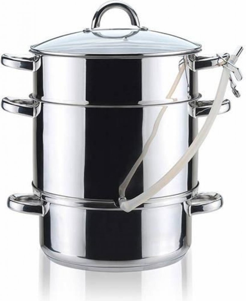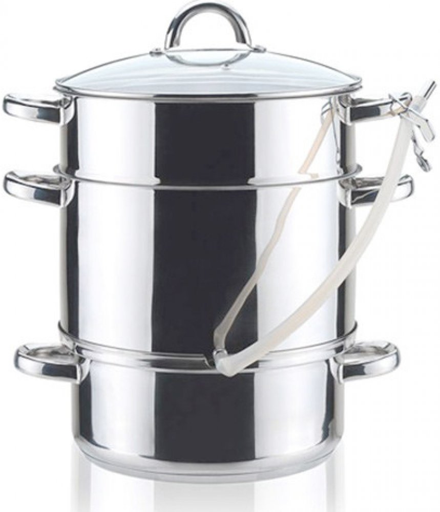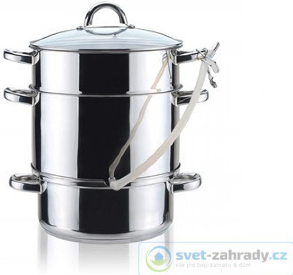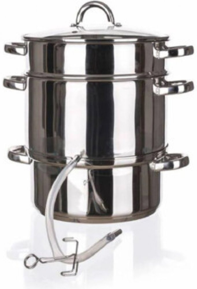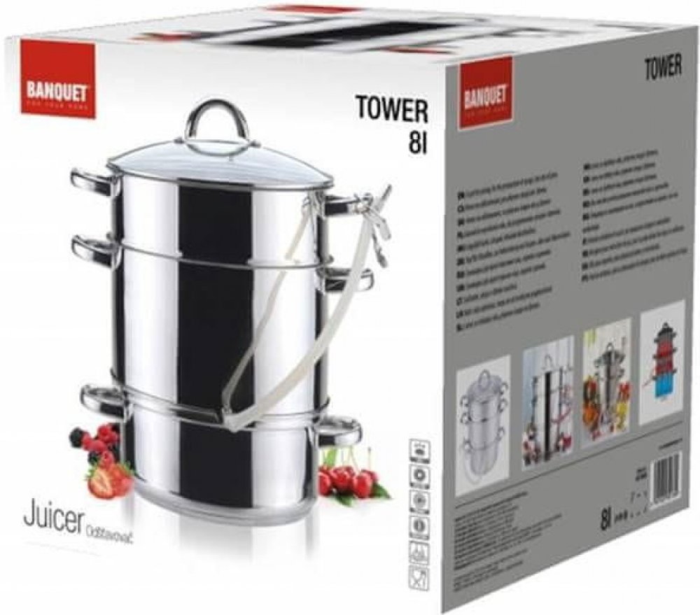 Nerezový odšťavňovací hrnec TOWER 8 l lze využít nejen na přípravu domácích sirupů, džemů a šťáv ze zeleniny, ale i na zdravou přípravu zeleniny v páře. Složení hrnce: skleněné poklice s otvorem pro únik páry, perforovaný hrnec na ovoce, sběrný hrnec na šťávu s vypouštěcí hadičkou, hrnec na vodu se sendvičovým dnem. Hrnec je vhodný na všechny typy sporáků včetně INDUKCE. Rozměry: 39 x 26 cm.