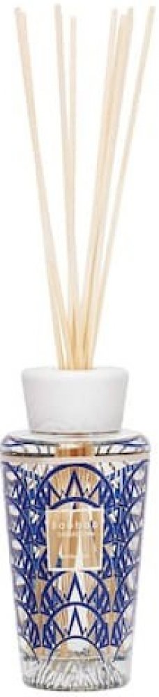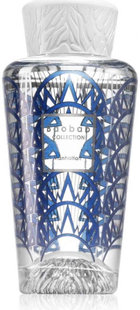 Pokojový difuzér Manhattan ve skleničce pokryté platinovým a tmavě modrým vzorem inspirovaným architekturou art déco, kterou představuje budova Chrysler Building. Vůně konvalinek, pižma a borovice vás přenese na roh Madison avenue a 82. ulice nebo vám připomene jarní vánek z Central Parku.