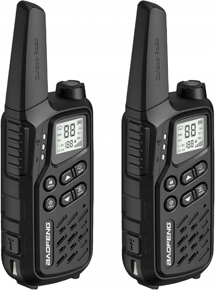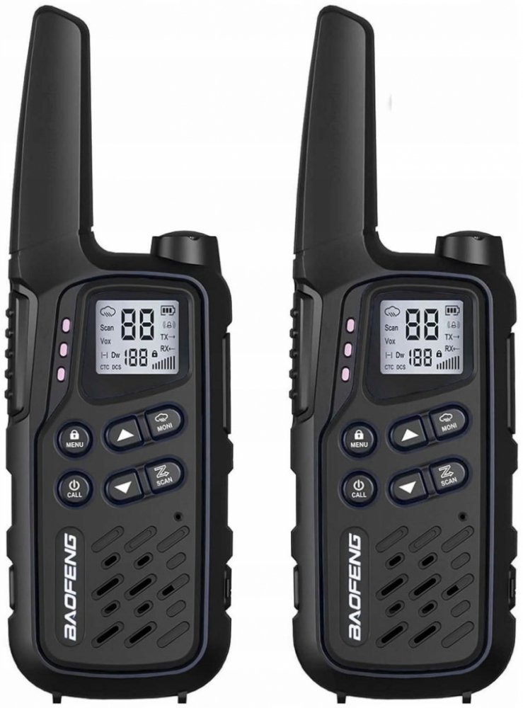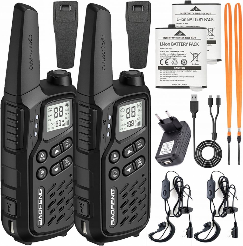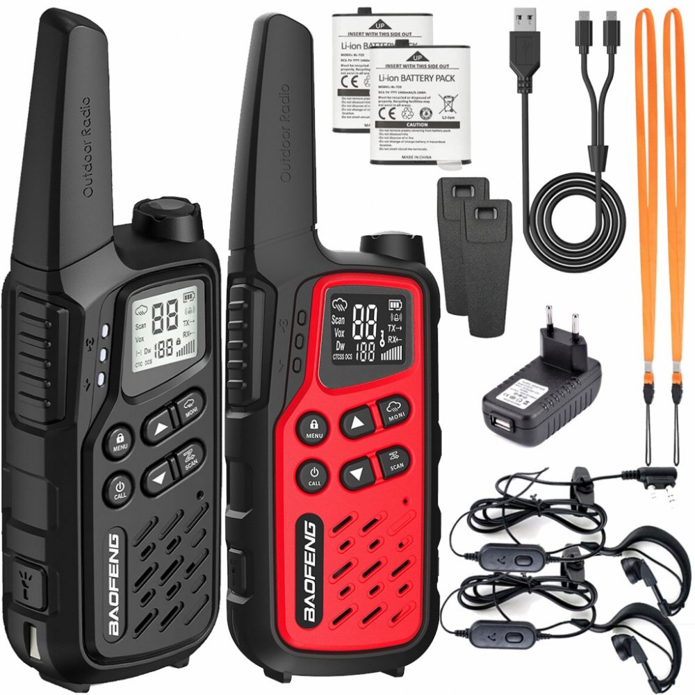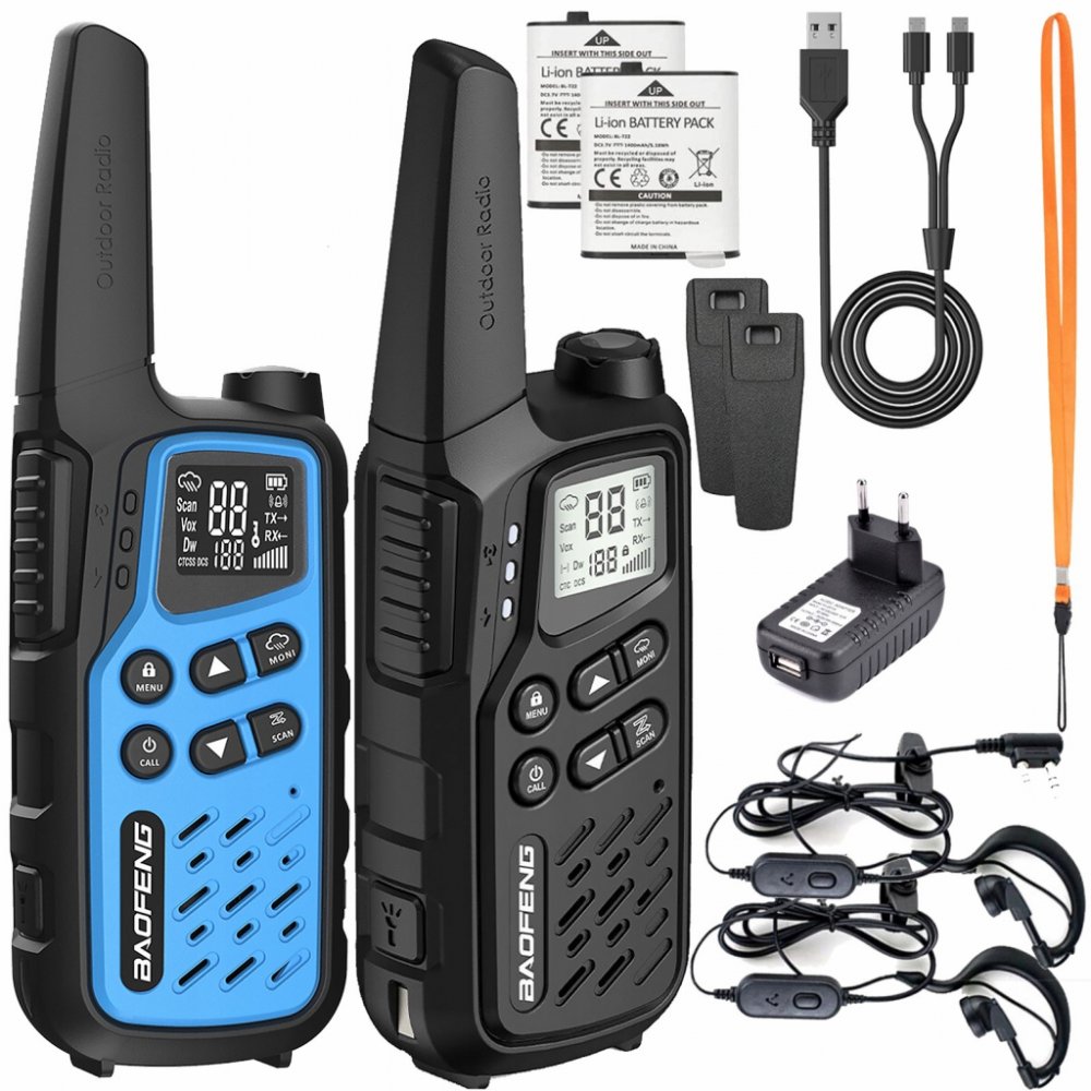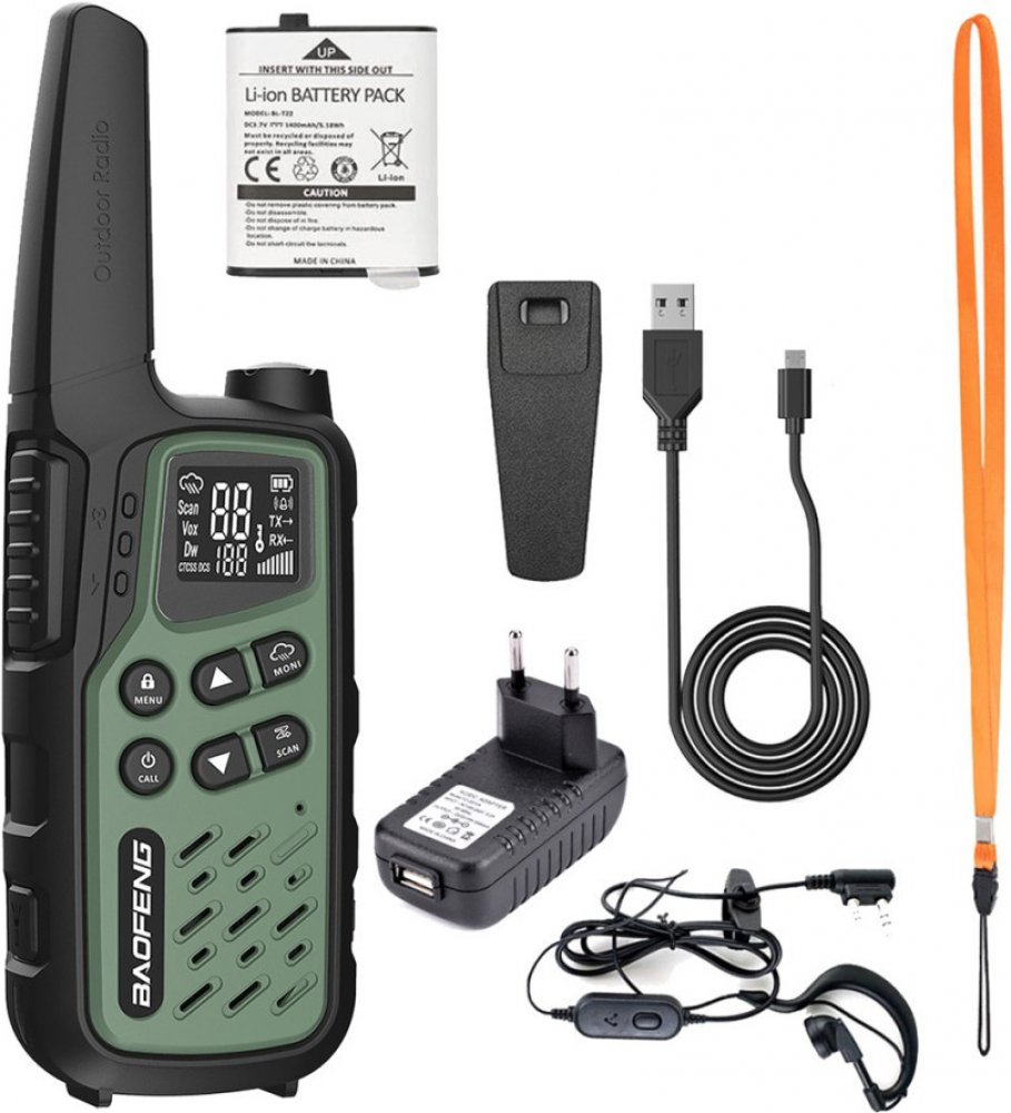 Obsah soupravy: 2x PMR rádio Baofeng BF-T25,2x 3,7V 1400mAh baterie, 2x PTT-1,1x AC adaptér (EU) 230V/USB, 1x USB nabíjecí kabel, 2x šňůrka