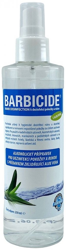 Dezinfekce na ruce a pokožku od americké značky BARBICIDE ve spreji k okamžitému použití. Účinná ochrana proti jakémukoli přenosu infekce. Obsahuje aloe vera, která zjemňuje pokožku a zabraňuje jejímu vysoušení.