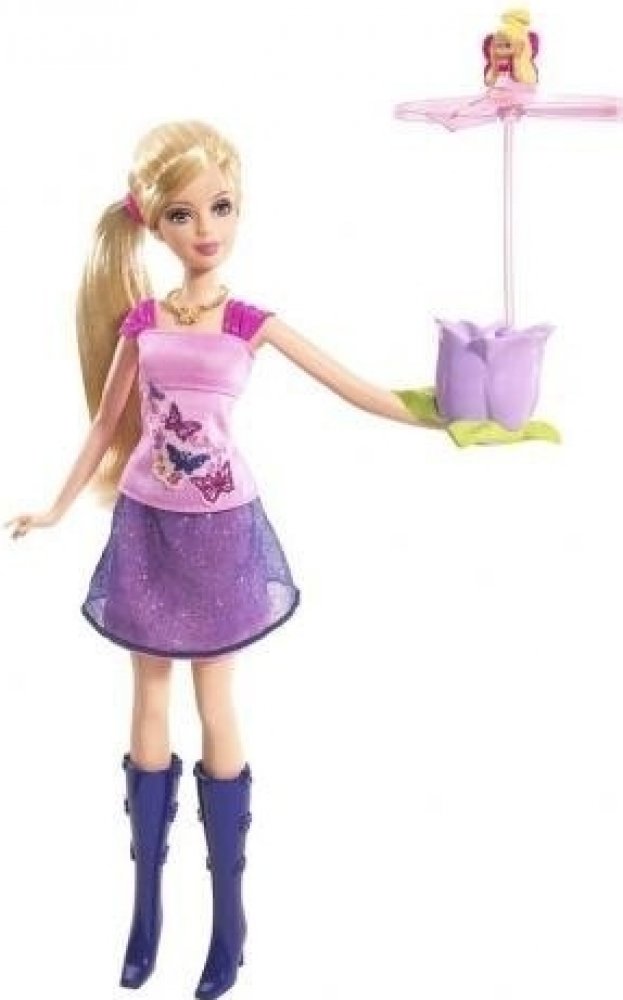 Pořiďte Vašim princeznám krásnou Barbie panenku, která je ozvláštněna květinou, ve které odpočívá malinkatá víla Thumbelina. Okouzlující okamžik Vás však čeká po zmáčknutí tlačítka, kdy se květina rozevře a víla znenadání roztáhne své doposud utajované fialové křídla. Užijte si s panenkou Barbie krásné okamžiky, které nejsou jen snem, ve kterém se zjevují víly. Barbie je jako vždy dokonale sladěná. Barbie má vysoké fialové kozačky na podpadcích, vzdušnou sukýnku v téže barvě a tričko zdobené barevnými motýlky. Této Barbie panence s květinou a vílou Thumbelinou můžete pořídit další kamarádky mini víly Thumbeliny nebo třeba Barbie auto, které dodá panence Barbie na její originalitě.