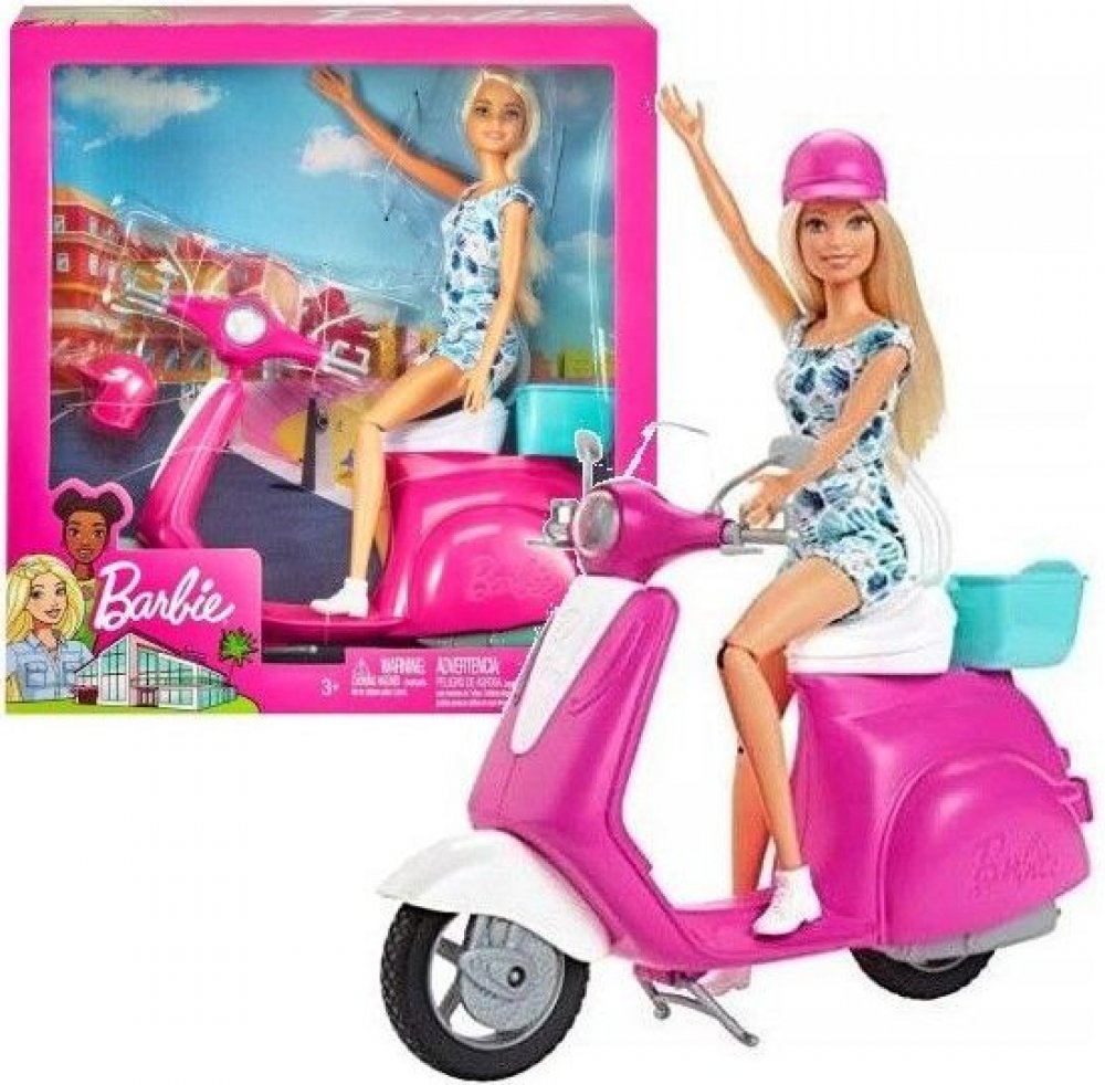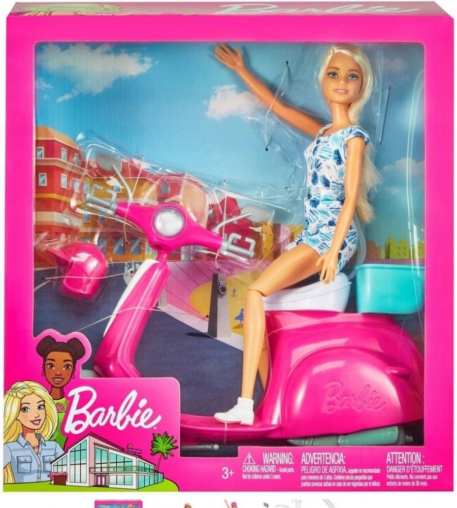 "Panenka Barbie® vydává na projížďku na skútru určeném pro cestování do říše fantazie! Růžovo-bílý skútr má patku, košík na zadní straně a kolečka, která otáčejí - stačí ho zatlačit a vyrazit za dobrodružstvím. Klip u sedla a úchyty na řídítkách drží panenku na svém místě a růžová helma zajišťuje bezpečnost při jízdě. Děti si užijí spoustu zábavy při objevování světa na koloběžce společně s Barbie...