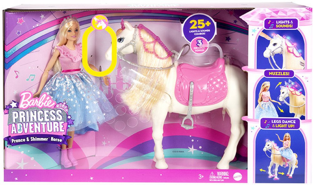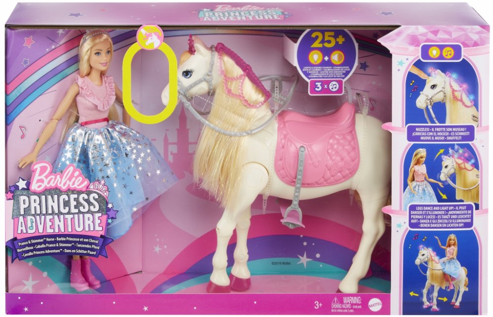 Připoj se k panence Barbie a vydejte se společně s jejím koníkem na cestu plnou kouzelných dobrodružství. Tato kolekce je inspirována oblíbeným filmem Princess Adventure, který vznikl na motivy populárního seriálu Barbie Dreamhouse Adventures. S panenčiným koníkem si užiješ spoustu zábavy. Koník se umí skutečně pohybovat a dokonce vydává i zvuky a svítí. Stiskni jeho čelo a sleduj, jak začne pokyvovat hlavou, řehtat nebo se pohybovat do rytmu písniček z filmu Princess Adventure. Panenka Barbie je oblečena do rozkošného princeznovského oblečku a díky ohebným kolenům ji můžeš pohodlně usadit do růžového sedla a její chodidla vložit do třmenů. Jsi připravena na vyjížďku? Rozměry kusového balení: 55 x 34 x 23 cm Na baterie: 4x AAA (nejsou součástí balení)