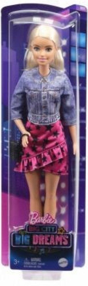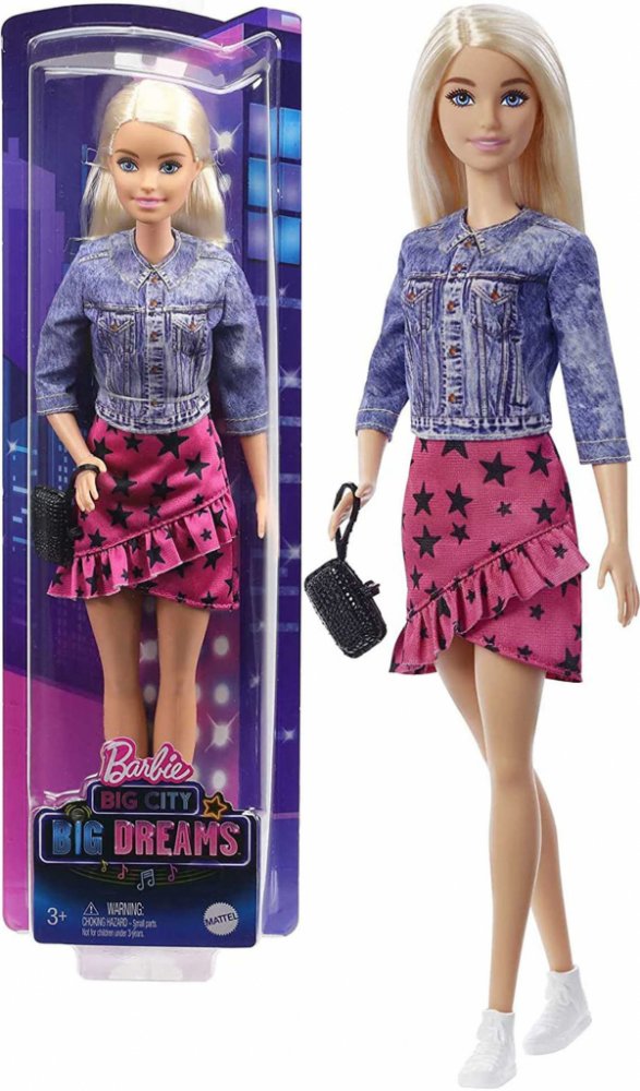 Panenka Barbie Malibu je oblečena ve stylu známém z filmu má džínovou bundu a stylovou růžovou sukni s hvězdičkami a volánky. Pohodlné bílé boty se skvěle hodí na jednodenní toulky městem a styling doplňuje stylová černá kabelka.