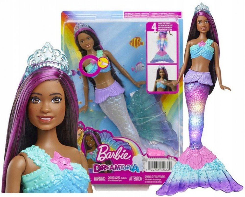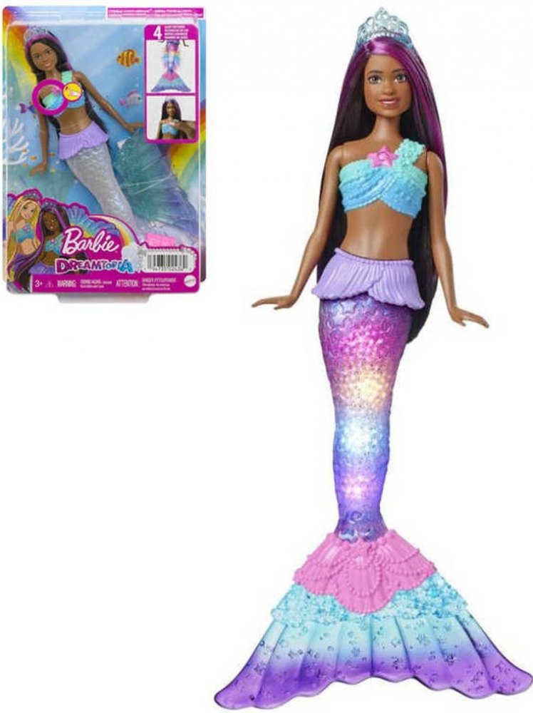 S panenkou Barbie Blikající mořská panna blondýnka se můžete zcela ponořit do vyprávění příběhů. Ponořte tuto krásnou panenku Barbie® do vody a uvidíte, jak její třpytivý perleťový ocas svítí jednou ze čtyř barevných show. Užijte si s panenkou Barbie šplouchání ve vaně nebo v bazénu anebo nechte děti přenést zábavu i na břeh - stisknutím tlačítka ve tvaru hvězdy na živůtku panenky Barbie si užijí světelnou show i bez vody. Duhové ploutve, růžový melír a princeznovský diadém doplňují barevný vzhled Barbie jako mořské panny. Panenka Barbie Blikající mořská panna je ideální pro vodní hrátky (nutný dohled rodičů) a je skvělým dárkem pro děti od 3 do 7 let. Panenka neumí samostatně stát nebo plavat. Hračka na baterie, se světlem.