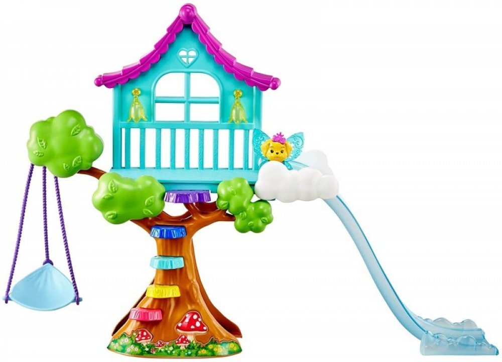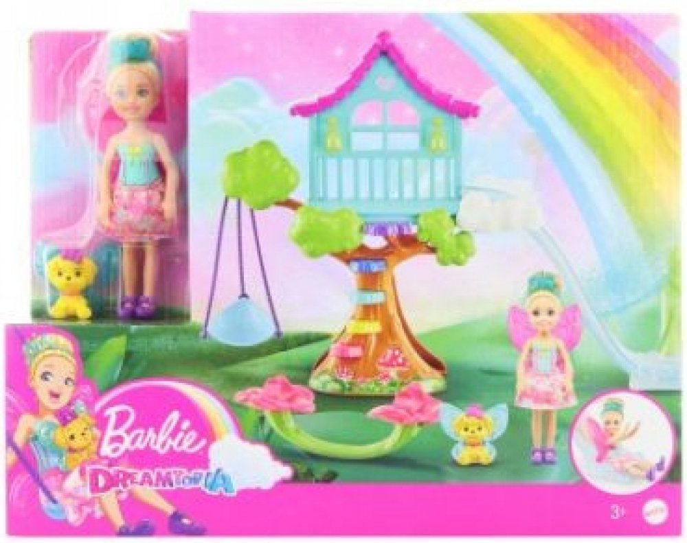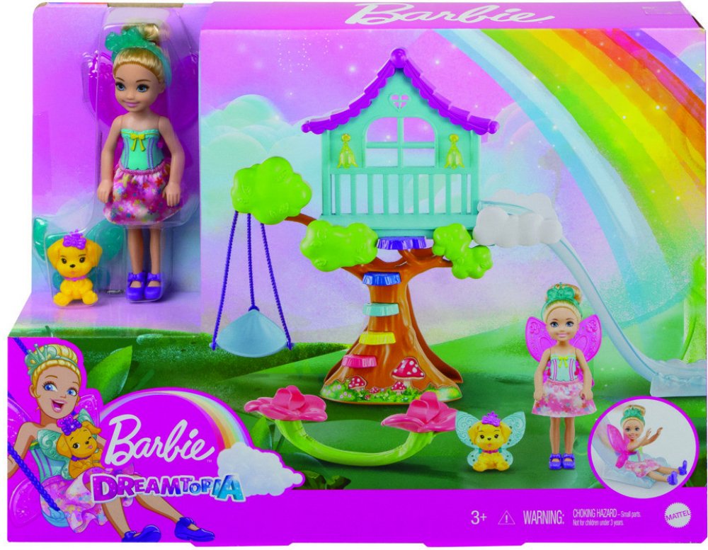 Inspirujte vyprávění pohádek s hracími sadami Chelsea ™ od Barbie ™ Dreamtopia! Kouzelné hřiště pro panenky Chelsea ™ se vyznačuje barevným designem a fantastickými detaily, které nechají příběh jít kamkoli, kam fantazie dětí povedou. Pomozte se panence Chelsea ™ a jejímu štěněcímu mazlíčkovi vyšplhat do fantastického domku na stromě, poté proklouznout mezi mraky, střídat se na houpací síti a spol...