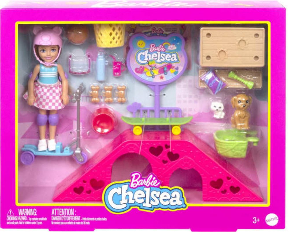 Panenka Chelsea a její dvě štěňata míří do skateparku s touto herní sadou Barbie, která obsahuje skate rampu, místo na piknik, basketbalový koš a více než 15 doplňků!