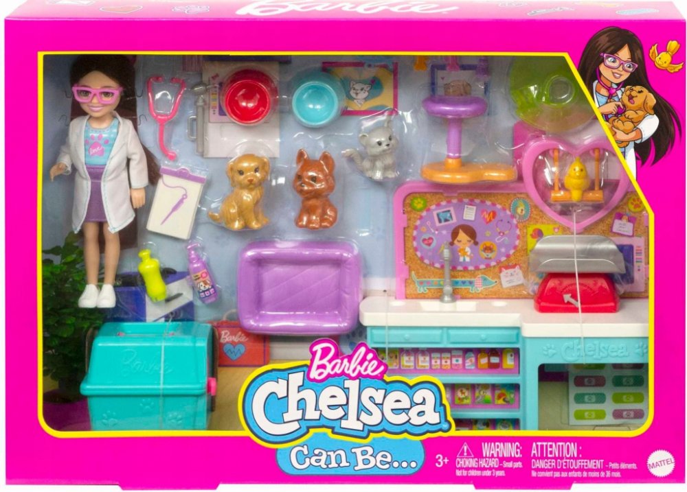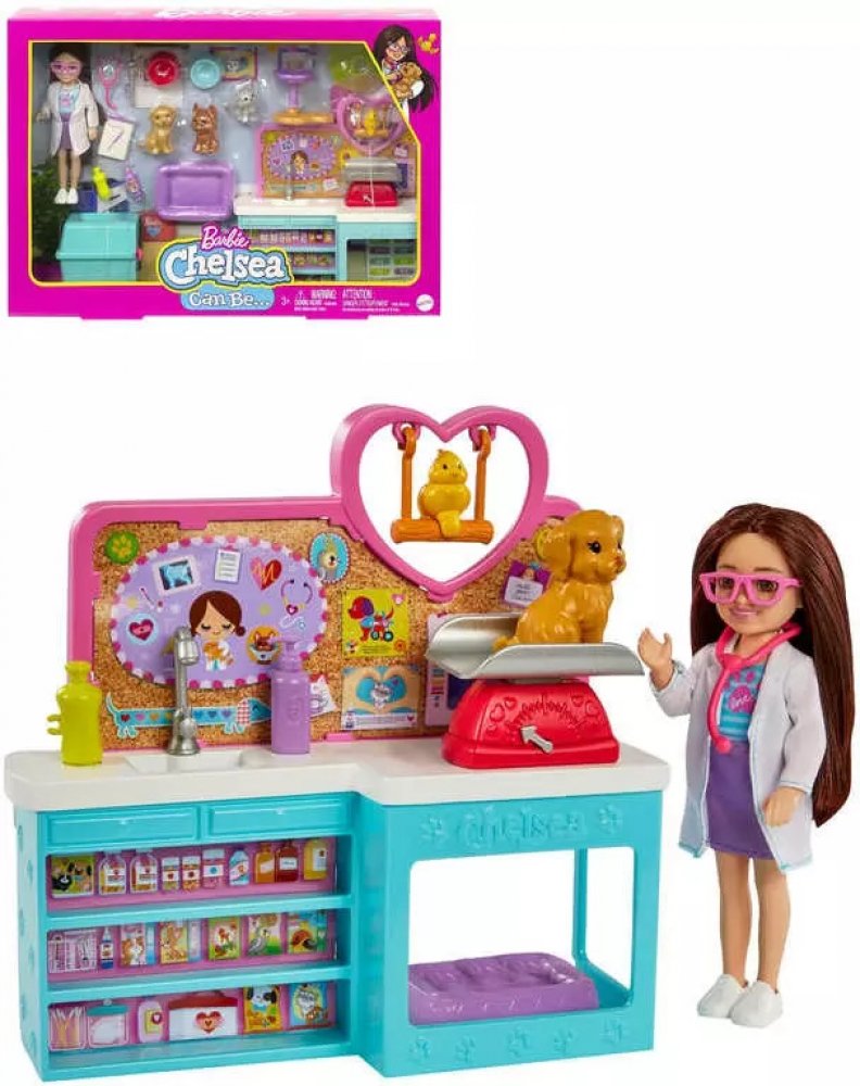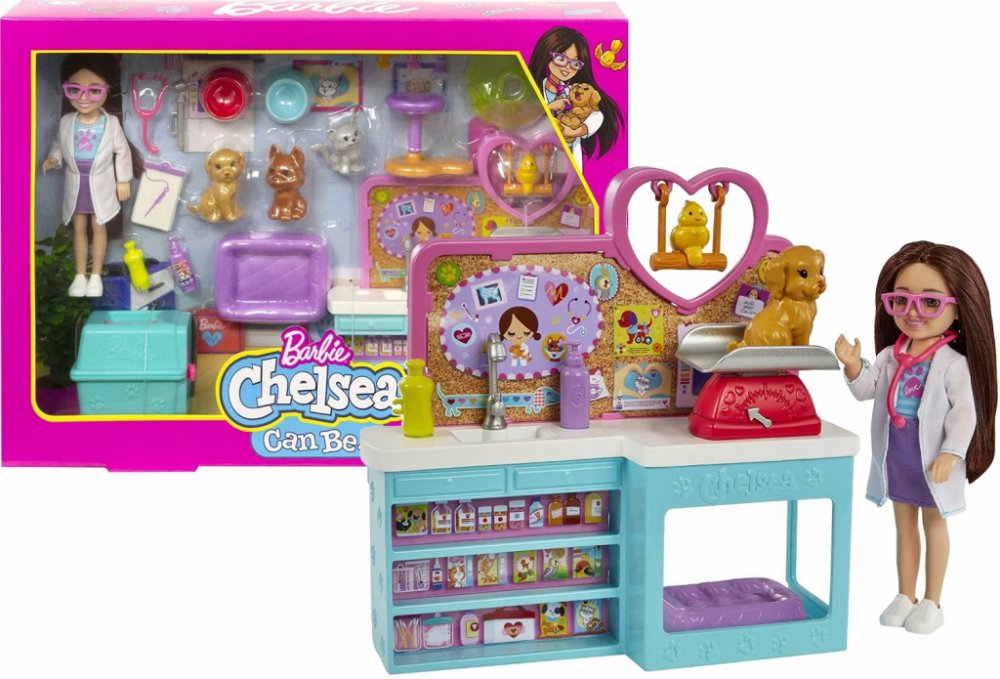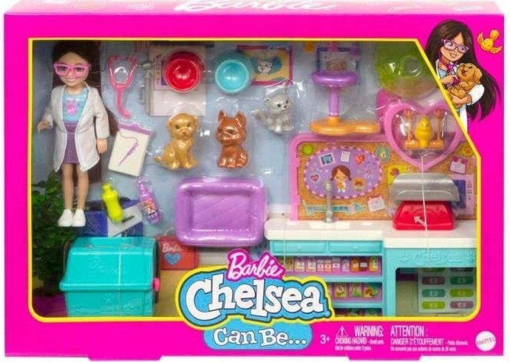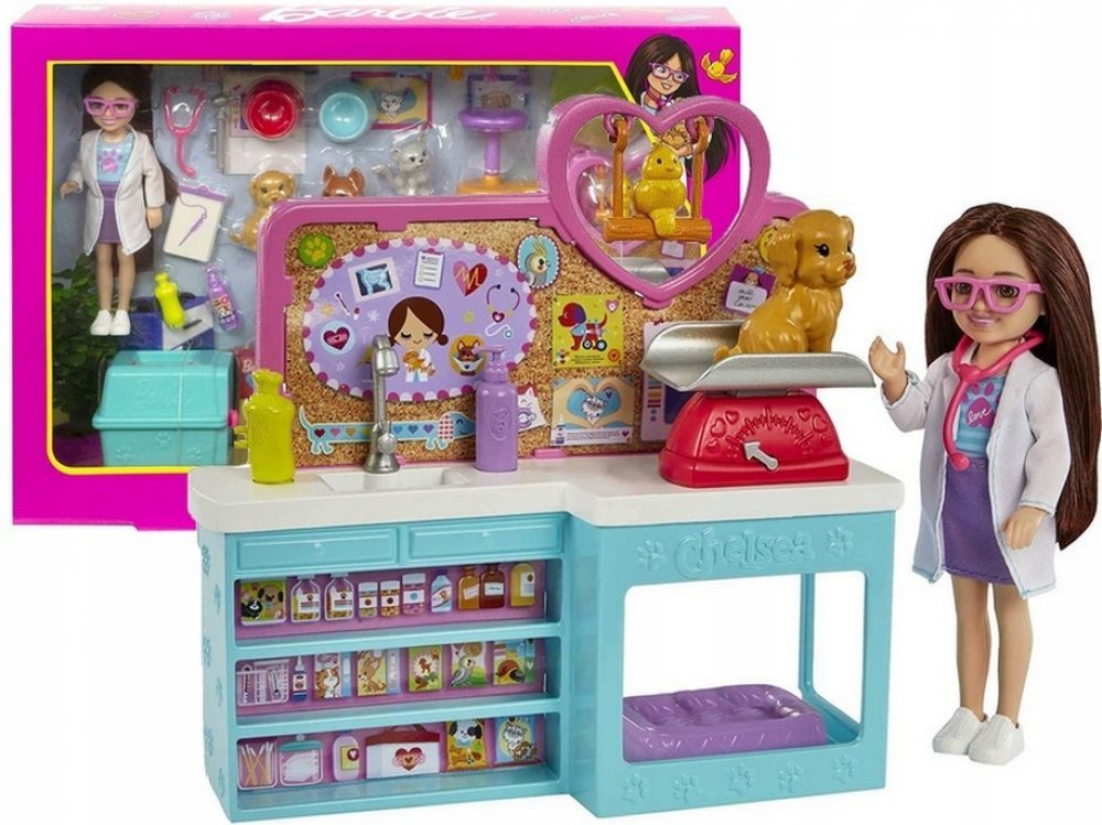Sada Barbie Chelsea Veterinář. Skládá se z malé panenky v zástěrce a figurek různých zvířátek (pejsek, kočička, kanárek). Součástí je také veterinární stanice se samolepkou reprodukující korkovou tabuli. Paní veterinářka může při péči o zvířata a jejich vyšetření používat váhu, stetoskop, zápisník, bidony a krmivo. Když je hotová, dá je do přepravky nebo je posadí na pelíšek. Vnitřní strana obalu ...