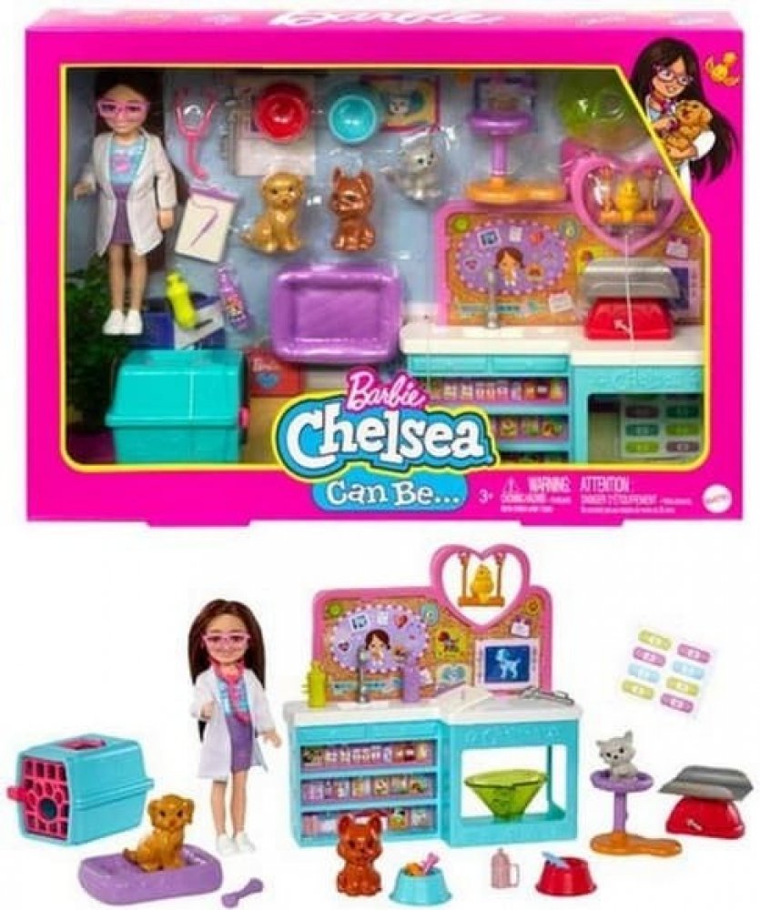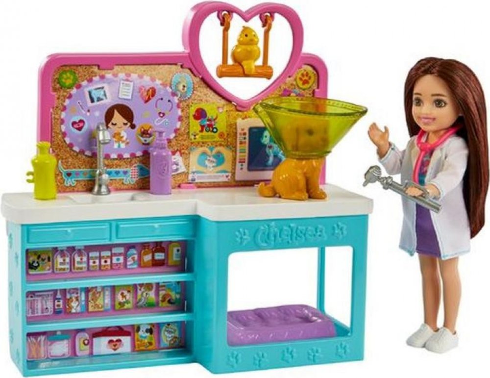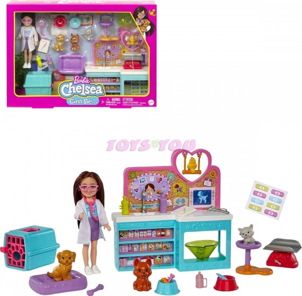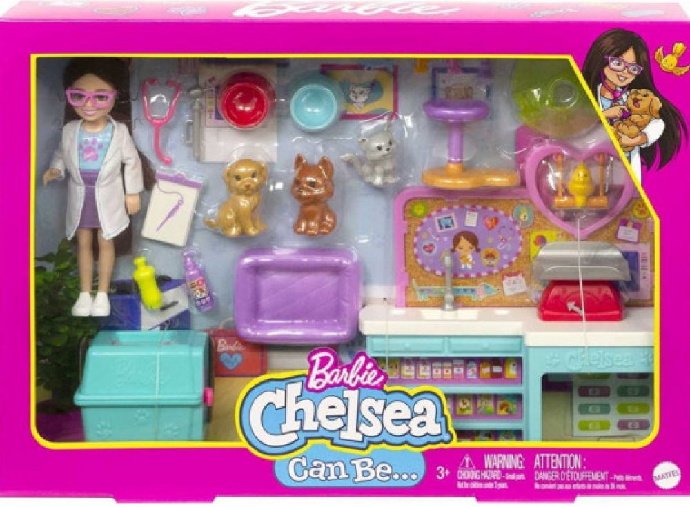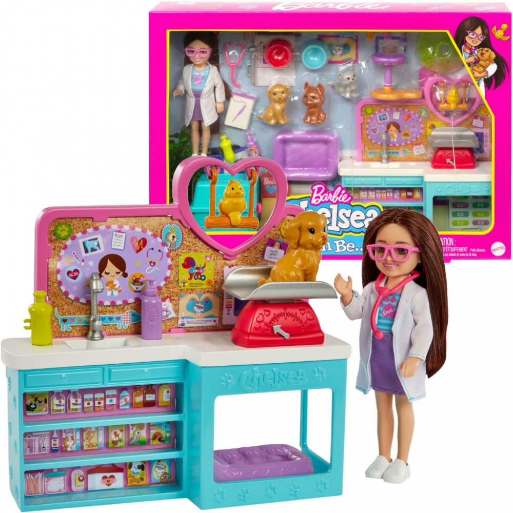 Sada Barbie Chelsea Veterinář. Skládá se z malé panenky v zástěrce a figurek různých zvířátek (pejsek, kočička, kanárek). Součástí je také veterinární stanice se samolepkou reprodukující korkovou tabuli. Paní veterinářka může při péči o zvířata a jejich vyšetření používat váhu, stetoskop, zápisník, bidony a krmivo. Když je hotová, dá je do přepravky nebo je posadí na pelíšek. Vnitřní strana obalu ...
