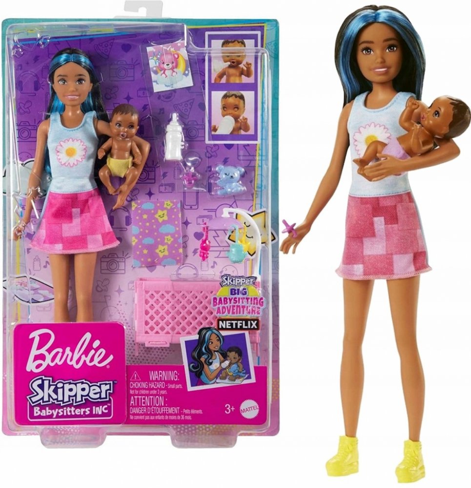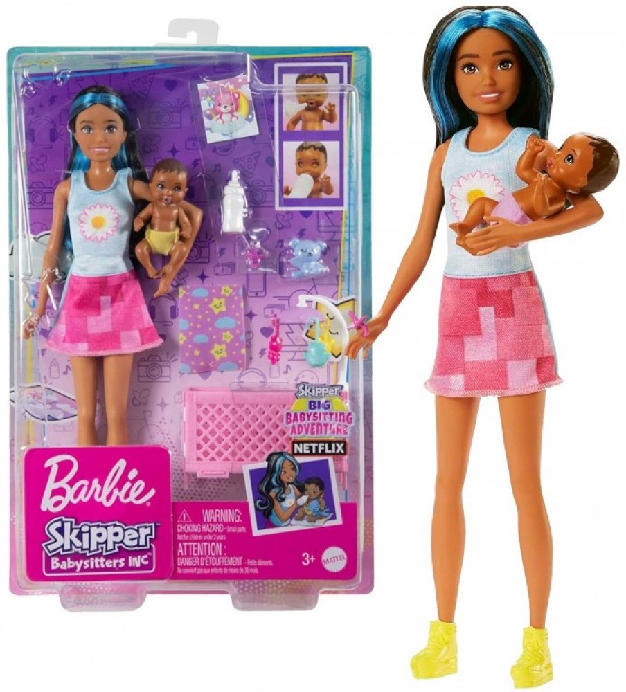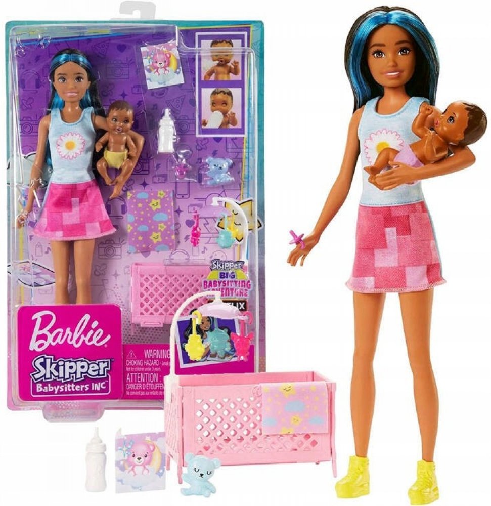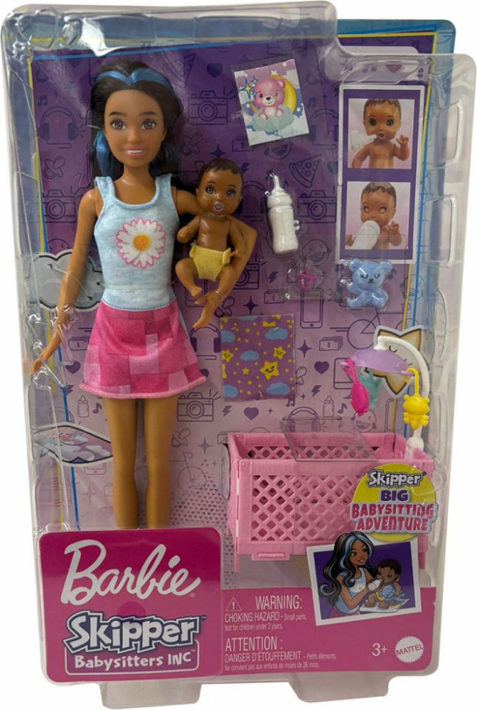 Panenka Barbie Skipper chůva – miminko s doplňky HJY34 Panenka má dlouhé tmavé vlasy s modrým melírem. Oblečené má modré a růžové šaty a žluté tenisky. Dítě samozřejmě nosí plenku. Souprava obsahuje láhev na krmení miminka a dudlík. Když dáváme miminku láhev nebo dudlík, vidíme, jak ospalě zavírá oči. Sada obsahuje: - panenku Barbie - malá panenka - postýlka s kolotočem - mini deku - medvídka - knížku s pohádkami na dobrou noc - láhev - dudlík Rozměry: - výška panenky cca 26 cm - panenka cca 6,5 cm Hračka má certifikát CE a je vhodná pro děti od 3 let.