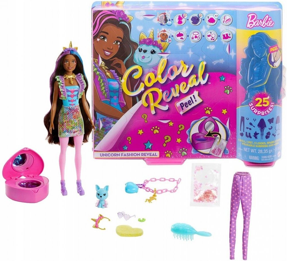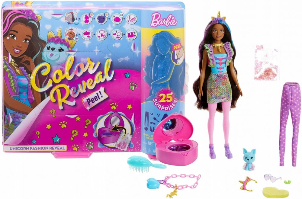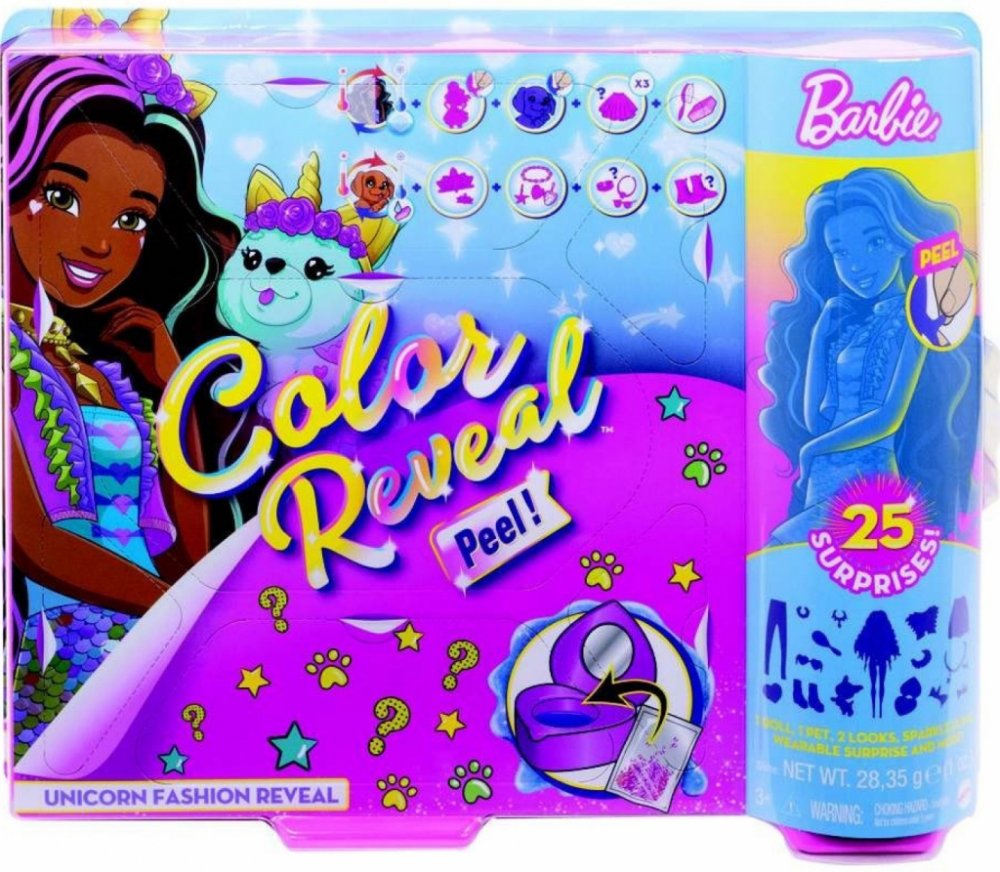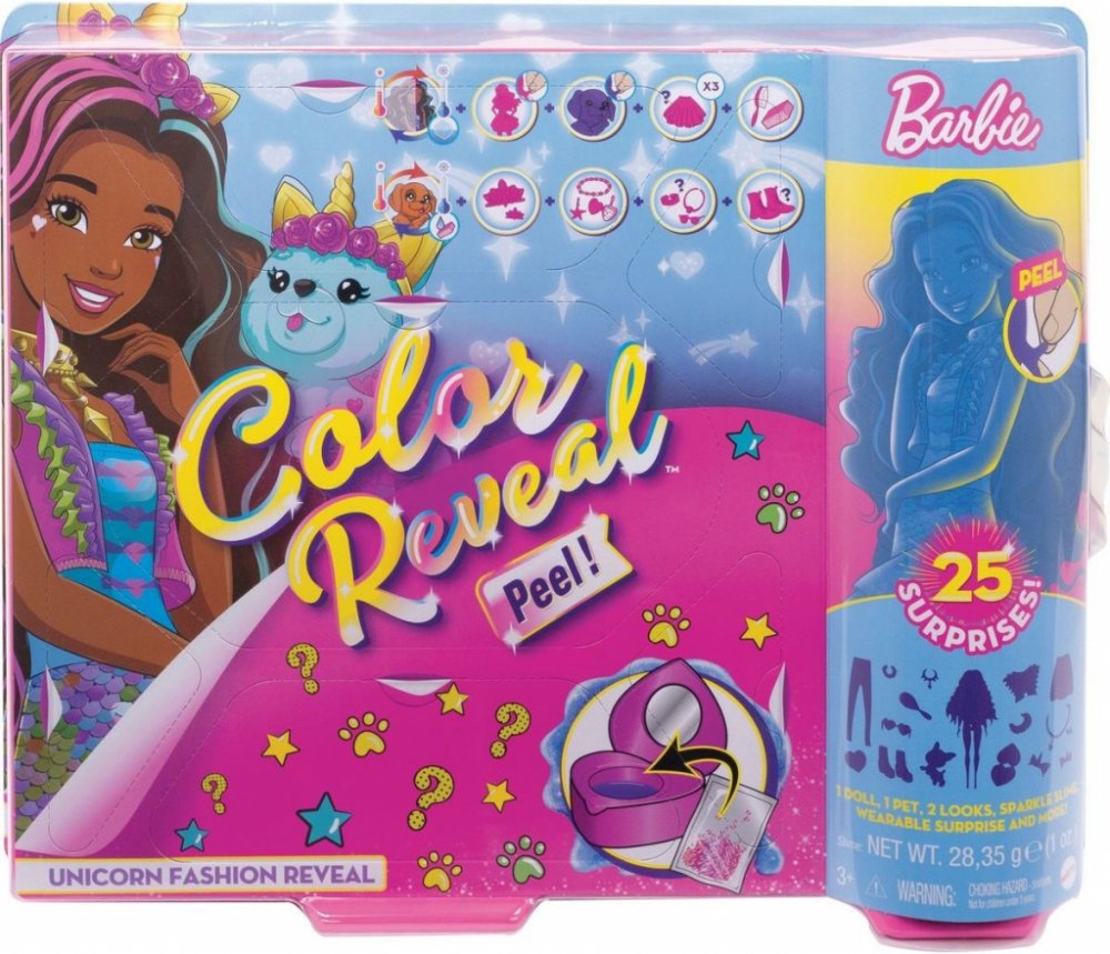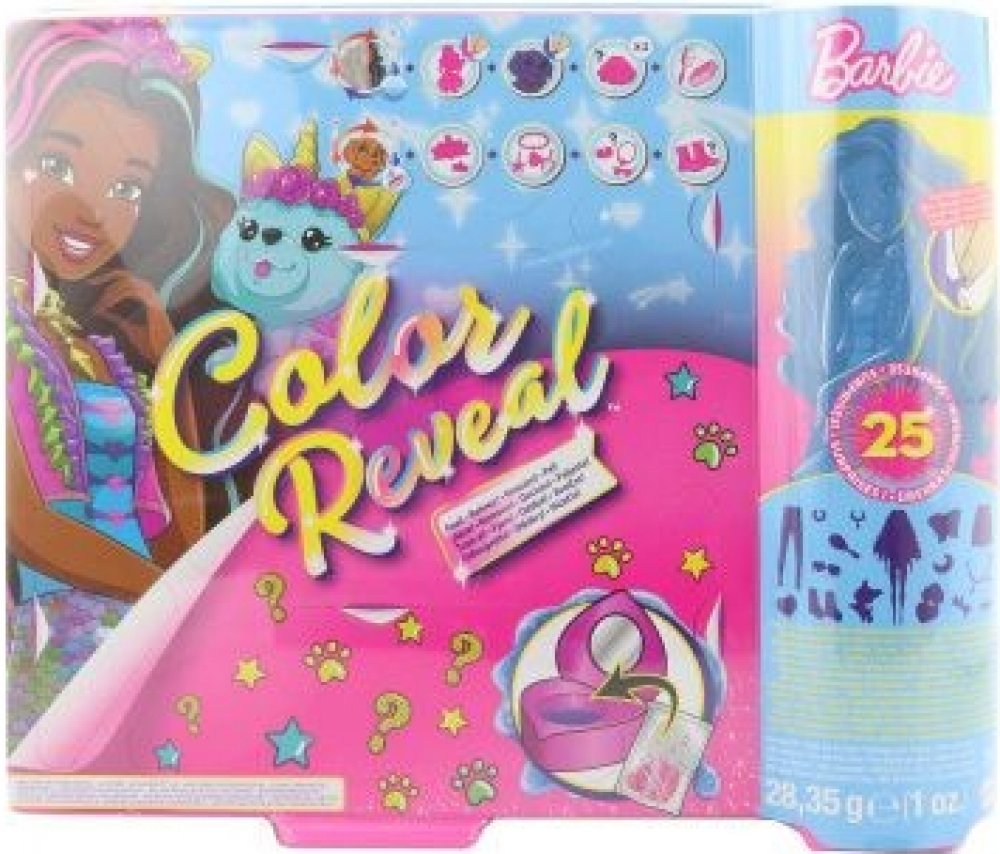 Tyto sady Barbie® Color Reveal™ zaručují dokonalý zážitek při rozbalování a nabízí 25 překvapení, ke kterým patří třeba změna barvy, zvířecí mazlíček, dva oblečky – jeden z nich ve stylu fantasy a panenku Barbie®, kterou můžeš do nekonečna měnit!