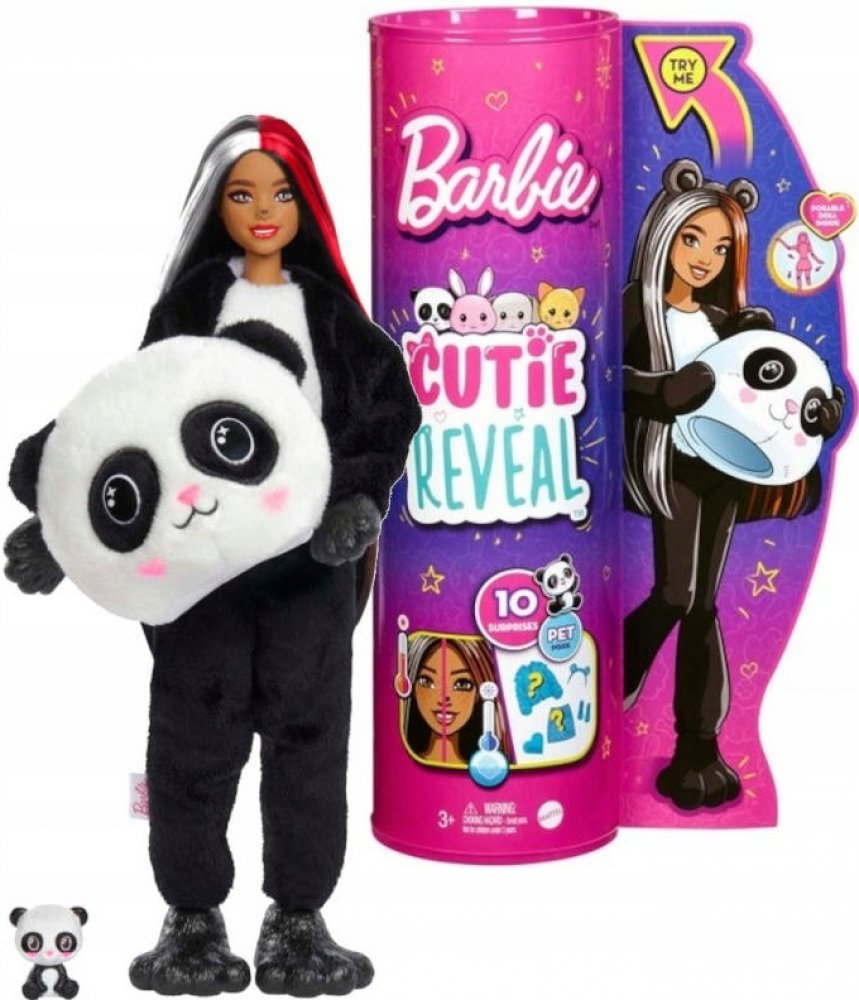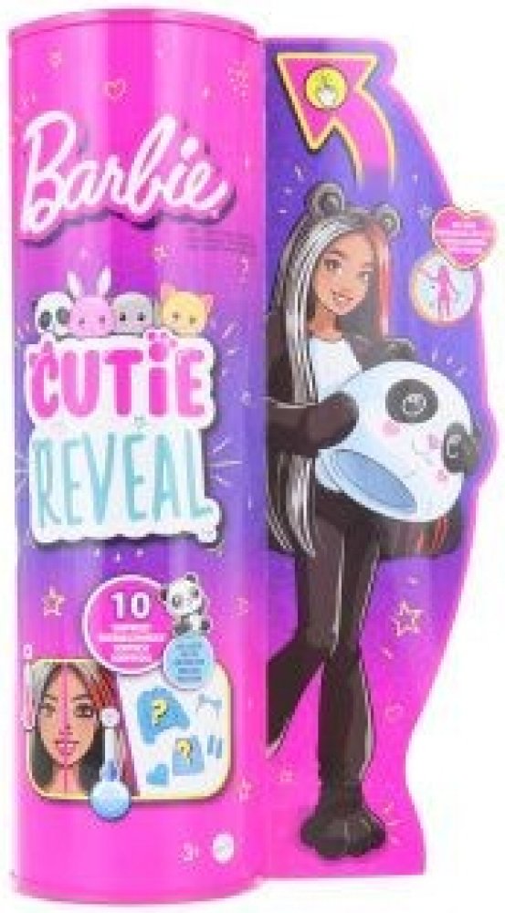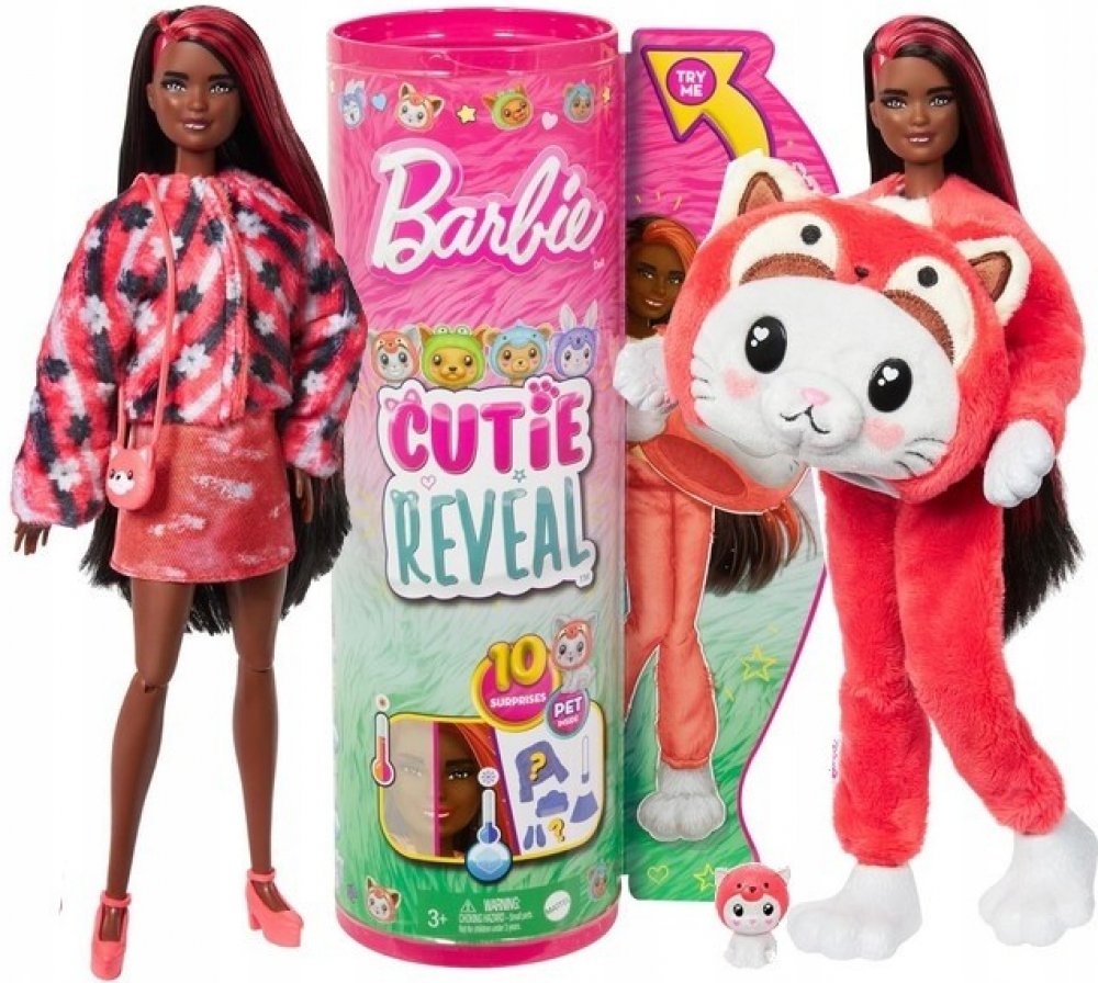 Krásná Barbie Cutie Reveal převlečena na roztomilé zvířátko. Rozbalte panenku Barbie a jejího mazlíčka a poté ji můžete obléci do plyšového kostýmu.