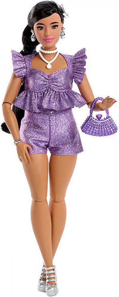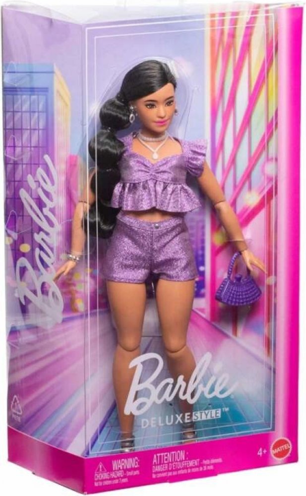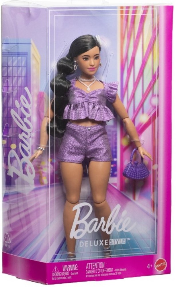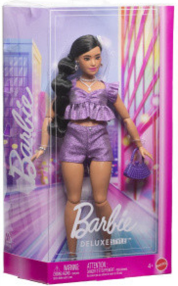 Barbie Deluxe modelka v outfitu s fialovými kraťasy potěší všechny milovnice módy, které rády tvoří vlastní trendy a stylové příběhy.