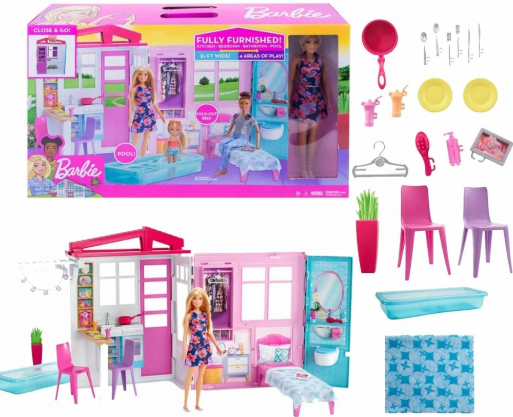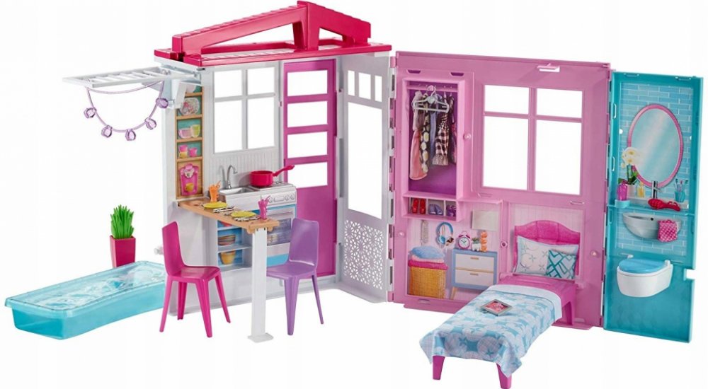 V kuchyni si panenky Barbie mohou přehrávat kulinářské příběhy pomocí realistického dřezu a varné desky. Ložnice nabízí rozkládací postel a skříň a koupelna má dokonce otevírací záchodovou klapku pro ještě větší autentičnost. Venkovní bazén, který lze naplnit vodou, zajišťuje skvělou zábavu při plavání zvýrazněnou pohádkovými světly.