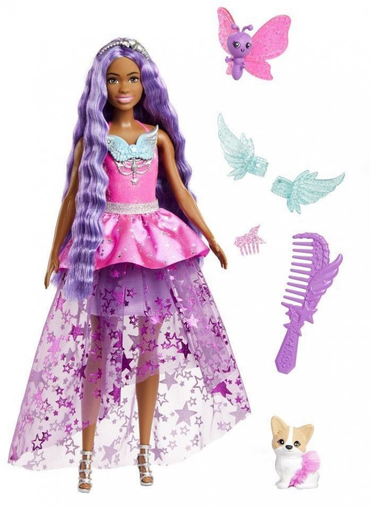 Panenka Barbie Brooklyn září v šatech inspirovaných jejím kouzelným vzhledem ve filmu Barbie a dotek kouzla! Panenka má na sobě pohádkové šaty s tylovou sukní ozdobenou hvězdami a s detaily křídel na živůtku. Její mazlíčci jsou také báječní, přichází s rozkošným motýlkem a štěňátkem, které nosí roztomilé tutu. Panenka má fialové vlasy o délce 17cm a doplňky jako hřeben, třpytivou čelenku a ozdobno...