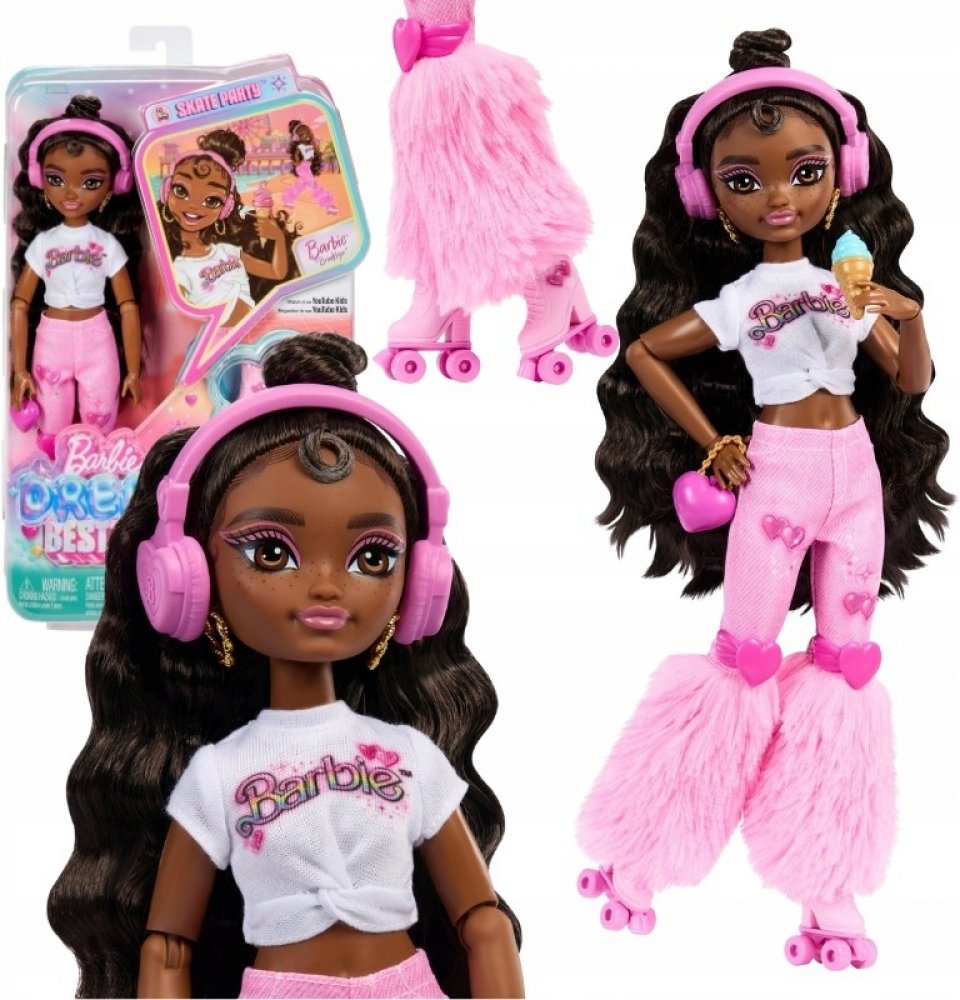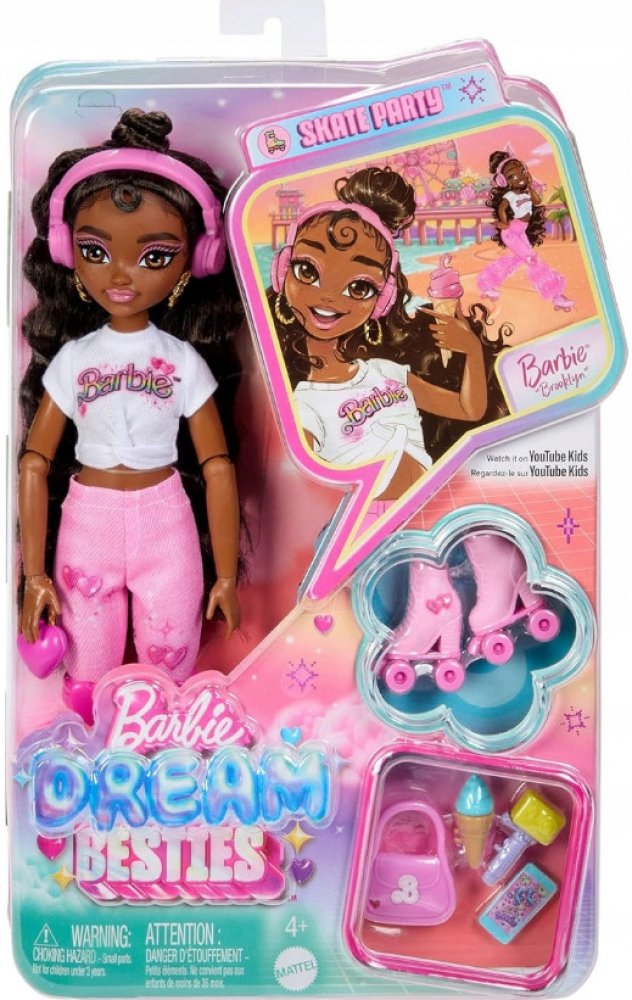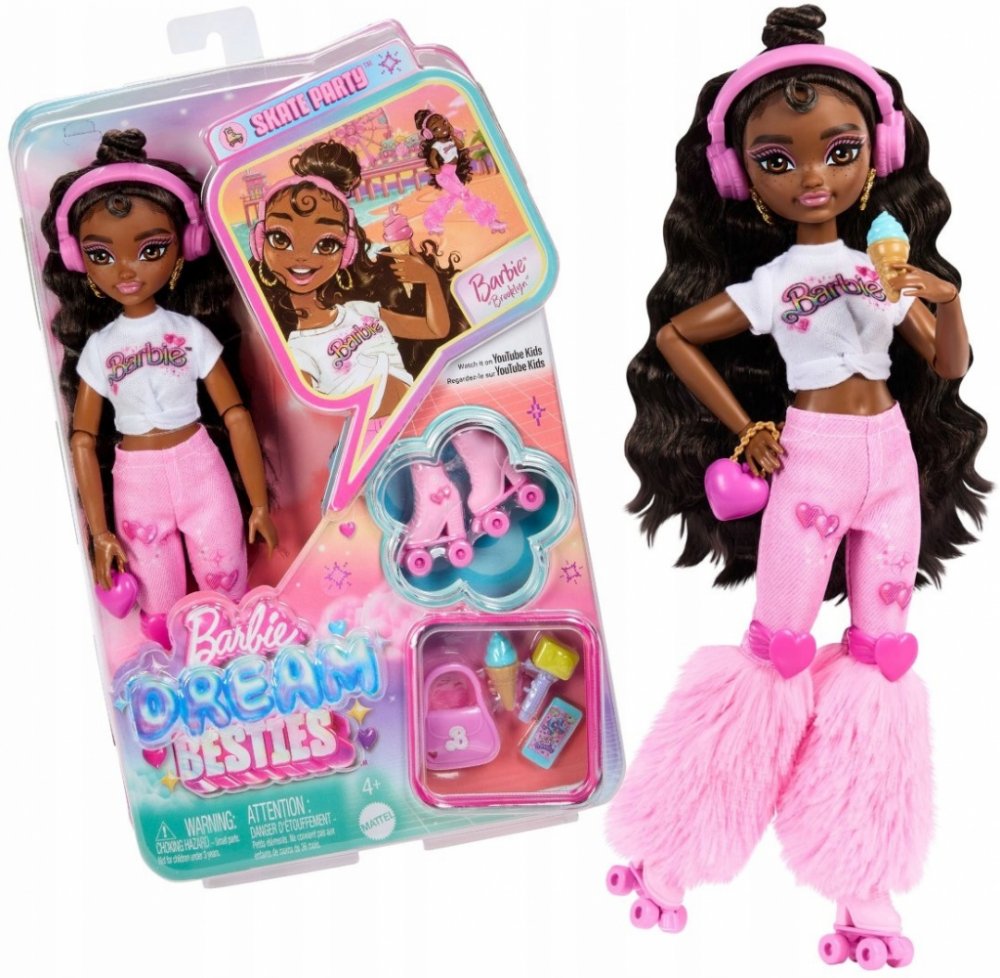 Lalka Barbie Dream Besties má nové hobby: jízdu na kolečkových bruslích! Tato Barbie Brooklyn v novém stylu inspirovaném motivem srdíček a rozkošnými kolečkovými bruslemi je připravena na nové dobrodružství. Barbie Brooklyn sní o kariéře choreografky a díky příslušenství jako je mobilní telefon, kamera s držákem a sluchátka je vždy připravena tvořit nové taneční sestavy.Dlouhé tmavě hnědé vlasy, které lze stylizovat různými způsoby.Inspiruje děti od 4 let ke splnění svých nejtajnějších snů.Loutka nestojí samostatně.Barvy a dekorativní prvky se mohou lišit.