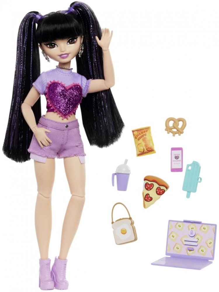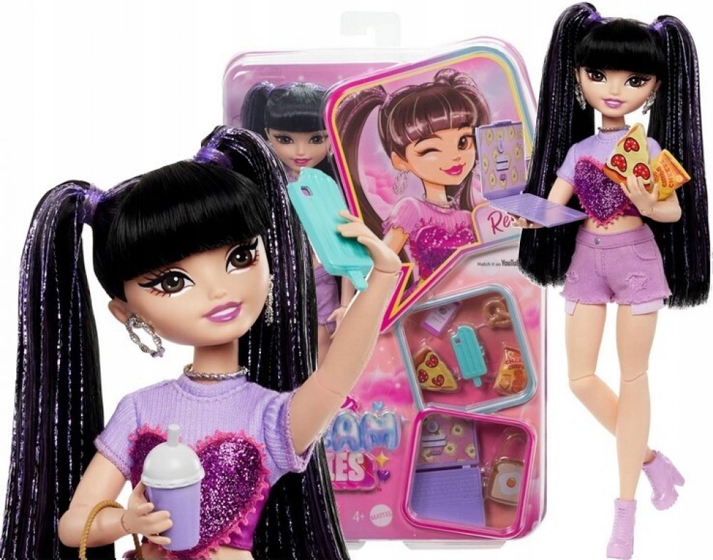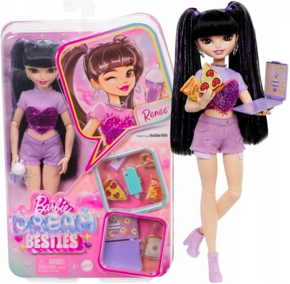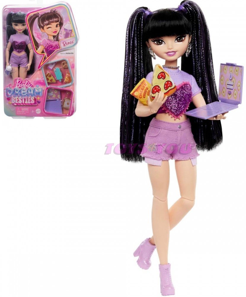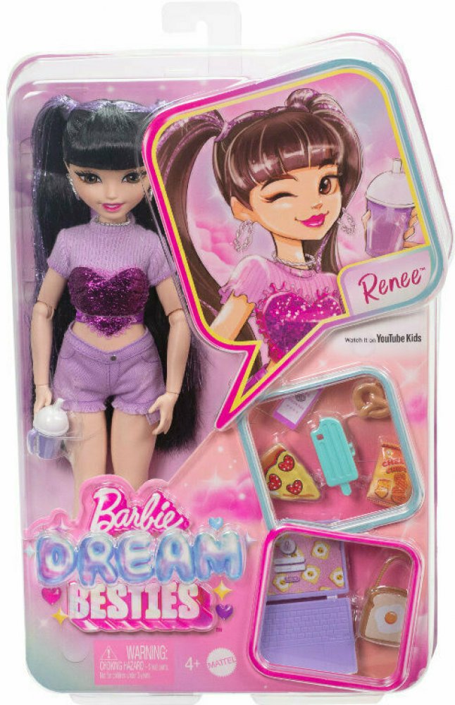 Nová řada panenek Barbie Dream Besties, které nejenže zaujmou svým svěžím vzhledem, ale také nabízejí trendy vrstvenou módu. Stylové panenky, které jsou propojené s digitálním obsahem, budou děti inspirovat k nejrůznějším dobrodružstvím v oblasti přátelství, školy a nakupování. Panenky Barbie Dream Besties povzbuzují děti, aby sdílely své jedinečné talenty se světem. Renée sní o tom, že bude moderovat kulinářský a cestovatelský pořad. Pomozte jí vytvářet vlogy s 11 doplňky, mezi které patří například pizza, preclík a notebook. Módní panenka má dlouhé černé vlasy s lesklými fialovými melíry pro zábavné hraní se stylingem. Součástí jsou doplňky jako notebook, kabelka ve tvaru toastu, plátek pizzy, preclík, balíček chipsů, smoothie, dále mobilní telefon a pouzdro na telefon. Panenka je polohovatelná a má odnímatelné oblečení a to třpytivý krátký top s fialovým srdcem, fialové džínové šortky a boty. Panenka Renée má dlouhé černé vlasy upravené do copánků s lesklými fialovými pramínky, které podtrhují její...