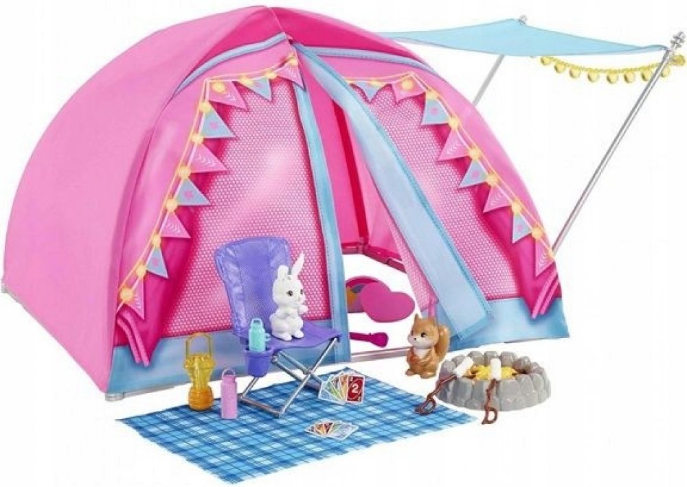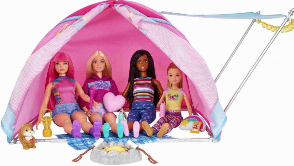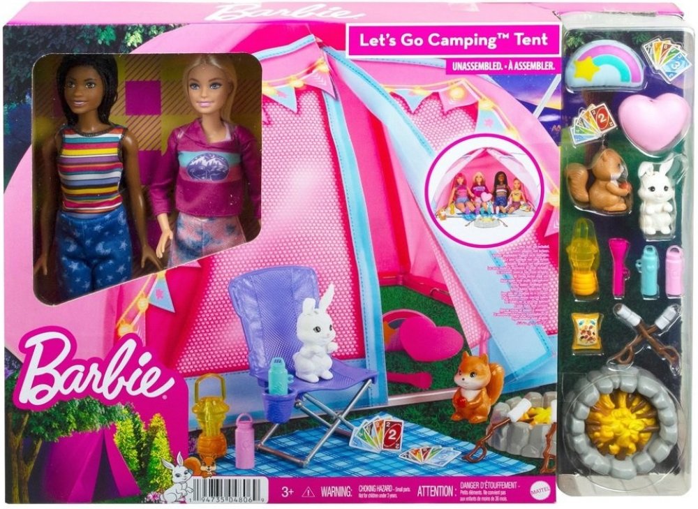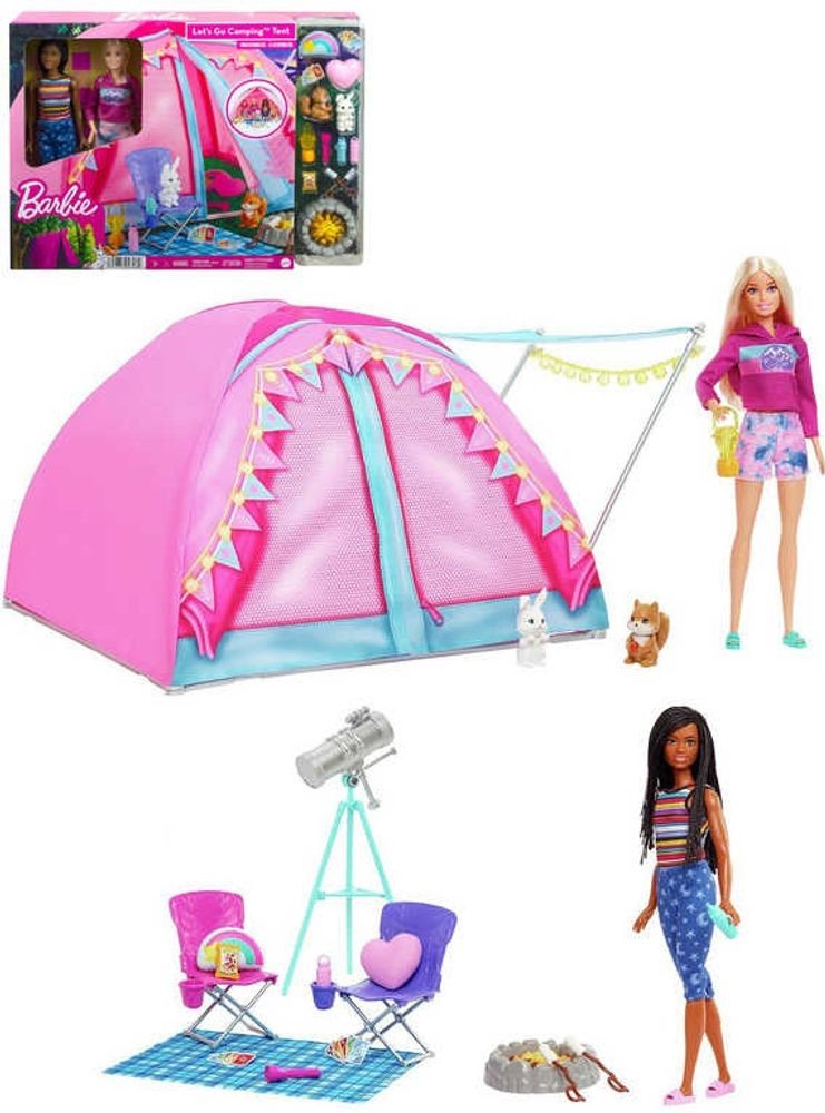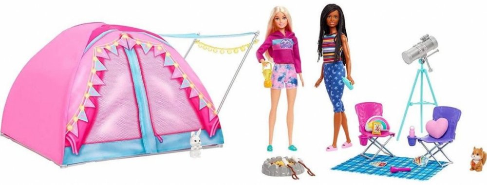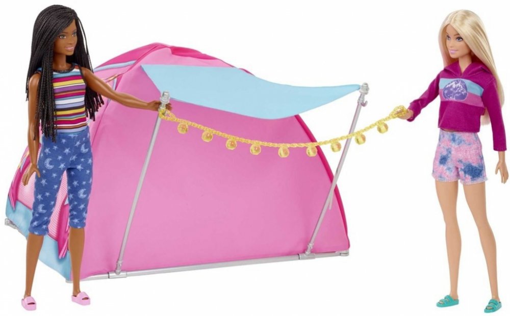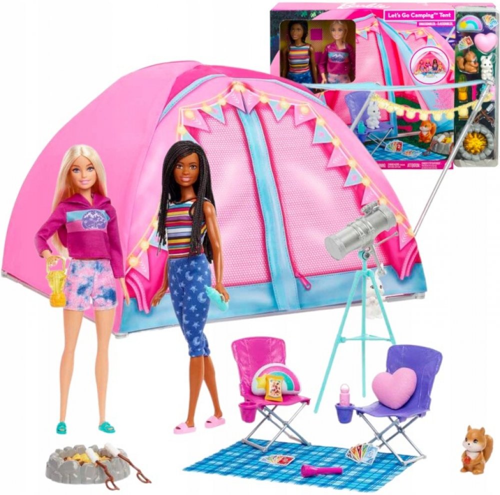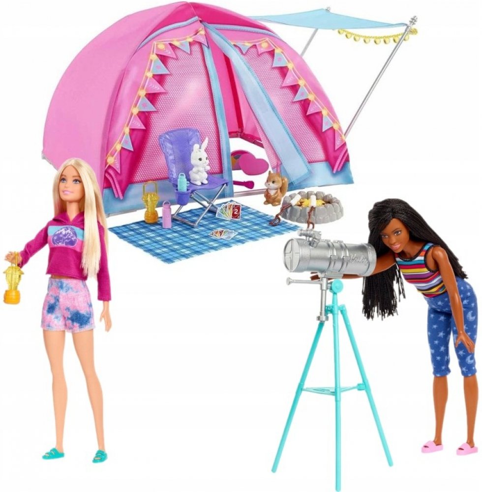 Tento herní set inspirovaný zbrusu novou sérií Barbie vybízí k dokonalému dobrodružství s panenkou Barbie „Malibu“ Roberts, panenkou Barbie „Brooklyn“ Roberts a jejich vlastním kempingovým stanem!