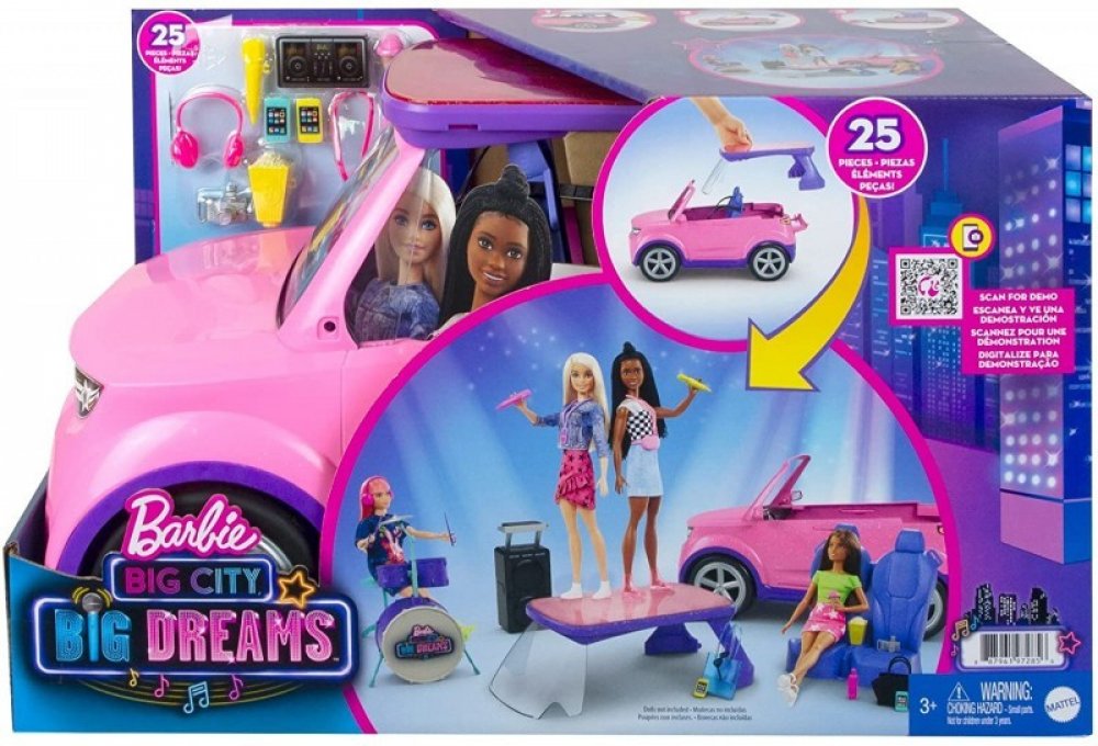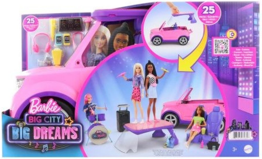 Ruszujte se na dobrodružství s tímto transformačním vozem Barbie, inspirovaným filmem Barbie: Big City, Big Dreams. Tento elegantní brokatově růžový automobil se snadno promění na koncertní scénu, což umožňuje spontánní vystoupení a zábavu pro vaše malé princezny. Vozidlo nabízí prostor pro dvě lalky Barbie (prodej samostatně) a je vybaveno realistickými detaily a otáčivými koly, které zajišťují autentický zážitek z jízdy.Sada obsahuje odnímatelnou střechu, která se přemění na scénu, a vyjímatelná sedadla, která slouží jako místa pro diváky. Kromě toho je součástí více než 20 tematických doplňků, včetně reproduktorů, mikrofonů, hudebních nástrojů a dalších rekvizit, které podporují kreativní hru a rozvíjejí představivost dětí. Díky snadnému uskladnění lze všechny prvky jednoduše zabalit zpět do vozidla, což usnadňuje úklid a přenášení.Klíčové vlastnosti 2v1 design: Přeměňte vozidlo na koncertní scénu během okamžiku. Reálné detaily: Brokatová růžová barva a otáčivá kola pro autentický vzhled. Odnímatelná střecha a sedadla: Umožňují vytvoření prostoru pro diváky a scénu. Více než 20 doplňků: Zahrnuje reproduktory, mikrofony, hudební nástroje a další rekvizity. Snadné uskladnění: Všechny části lze snadno uložit zpět do vozidla. Podporuje kreativní hru: Ideální pro rozvíjení představivosti a sociálních dovedností dětí. Vhodné pro děti od 3 let: Bezpečné a zábavné pro malé fanoušky Barbie.