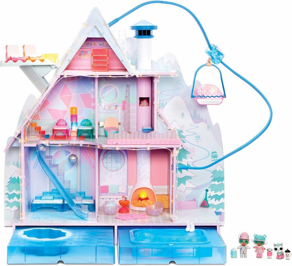 Útulný domek pro panenku Barbie a její sestřičky. Ideální místo, kde strávit zimní prázdniny. Domeček má krb, spoustu poliček, k.