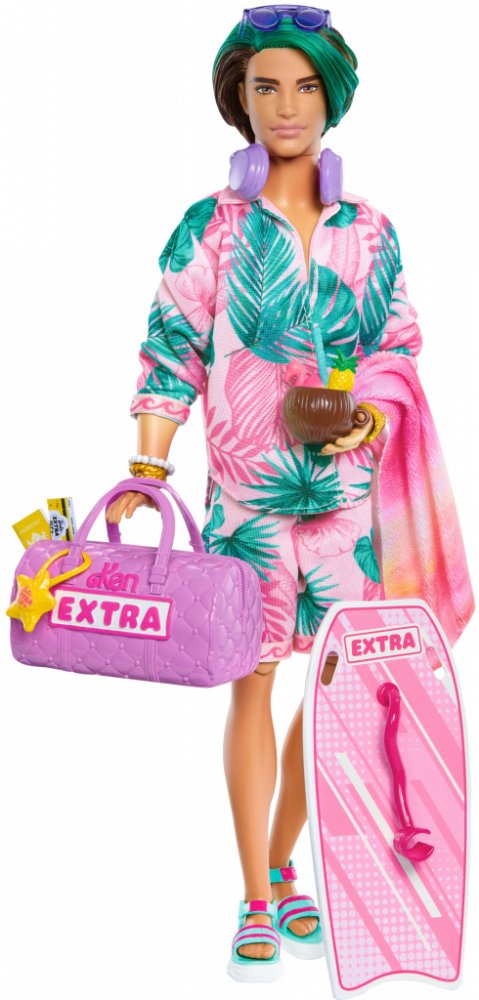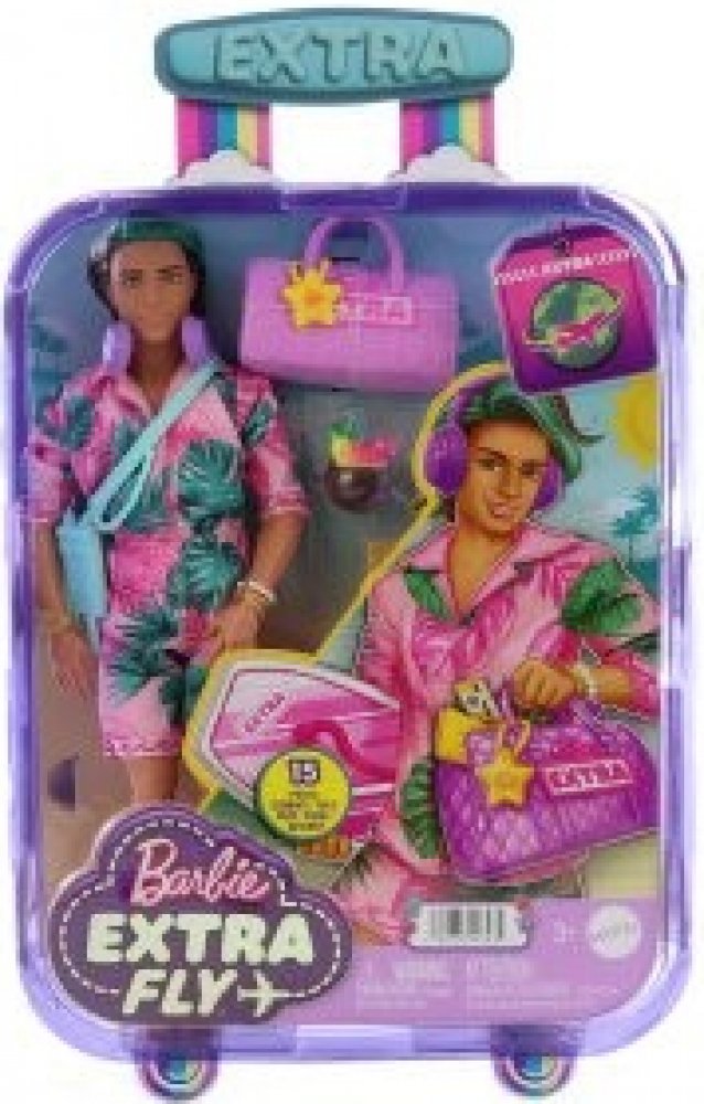 Panenka Ken® jede na plážovou dovolenou ve svém tropickém oblečení! S kloubovým tělem je tato pohyblivá panenka připravena na zábavu na slunci! Svůj sebevědomý plážový styl předvádí sladěným růžovým a modrozeleným tropickým potiskem v kombinaci se sandály. Vše je o EXTRA detailech! Panenka Ken® je dodávána s 15 doplňky, jako jsou sluneční brýle, boogie board, ručník a kokosový nápoj, které inspirují k sebevyjádření a stylingové zábavě. Cestovní kousky přidávají na vyprávění. Tato panenka s plážovým motivem je dodávána s fialovou taškou, sluchátky, visačkou na zavazadla s hvězdičkou, pasem a letenkou! S tolika zábavnými stylovými a cestovními kousky jsou panenky Barbie® Extra Fly™ skvělým dárkem pro děti, které milují módu a cestovatelská dobrodružství! Věk 3+