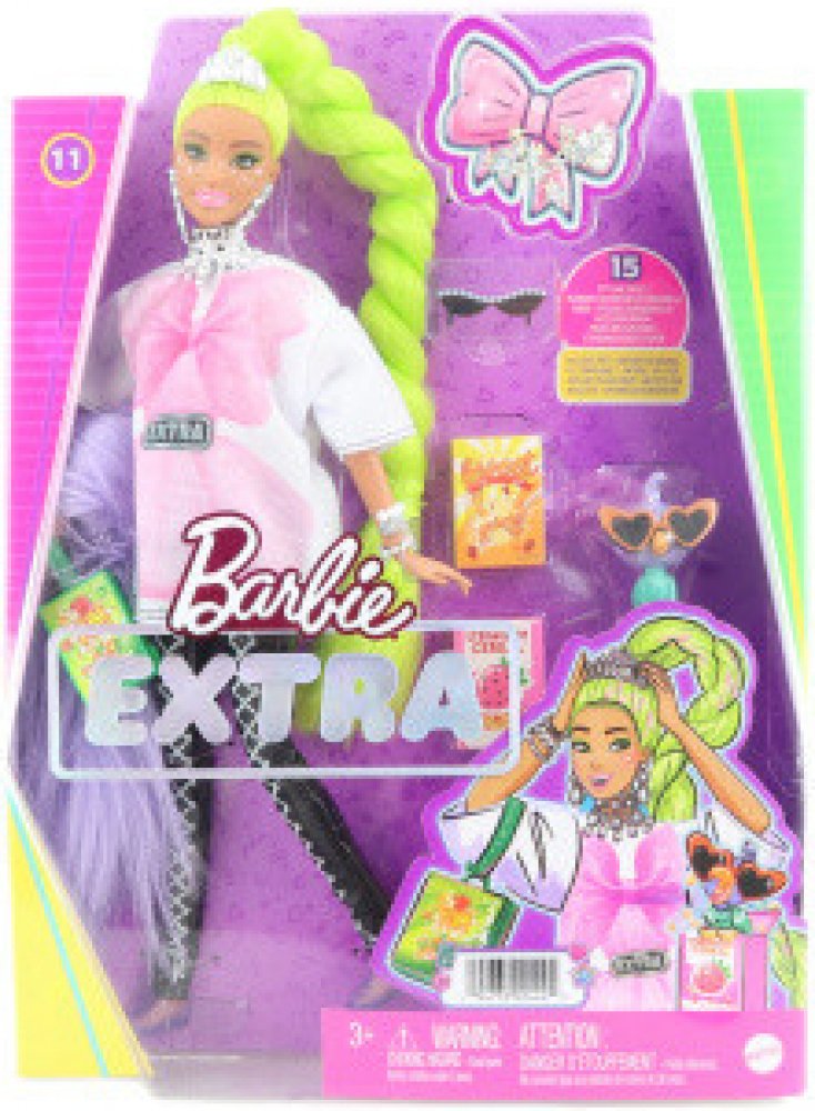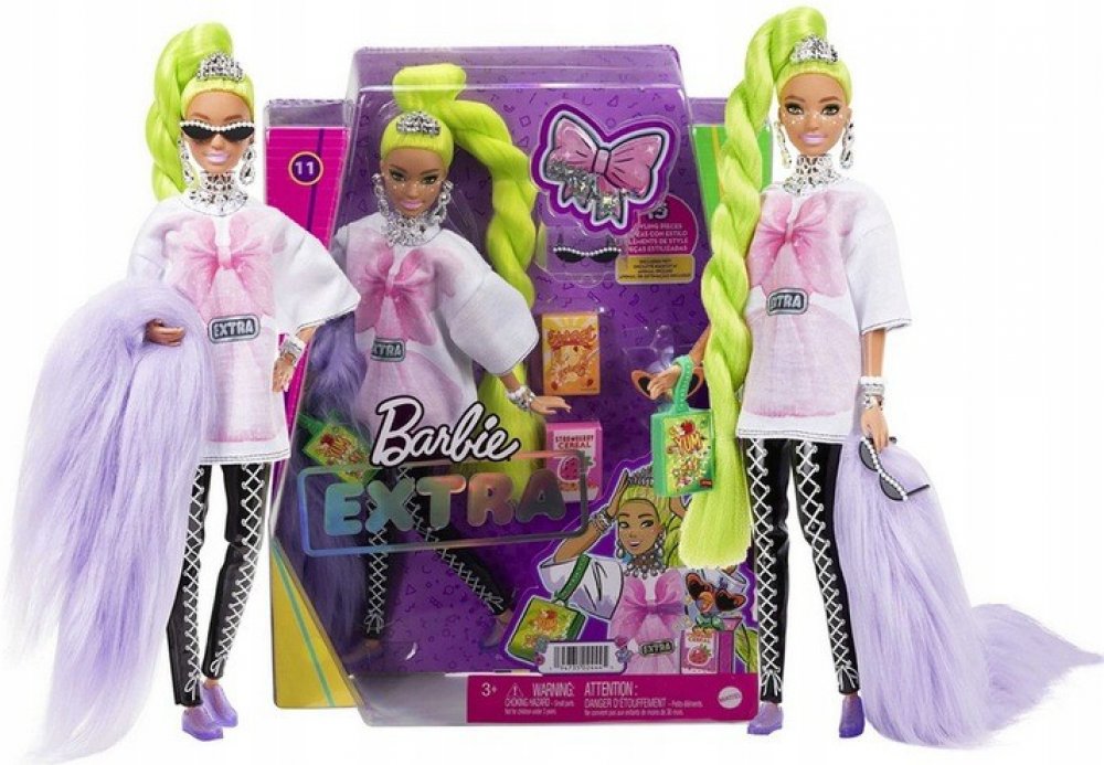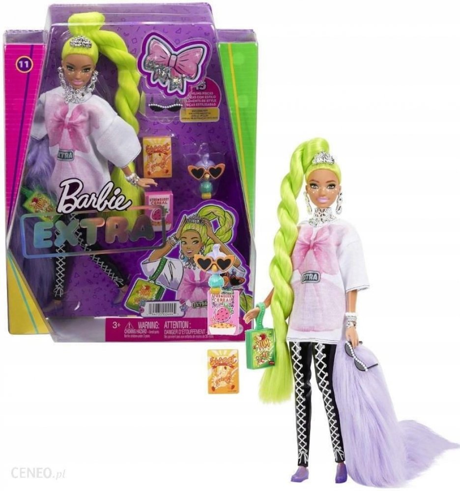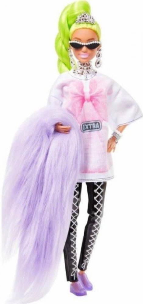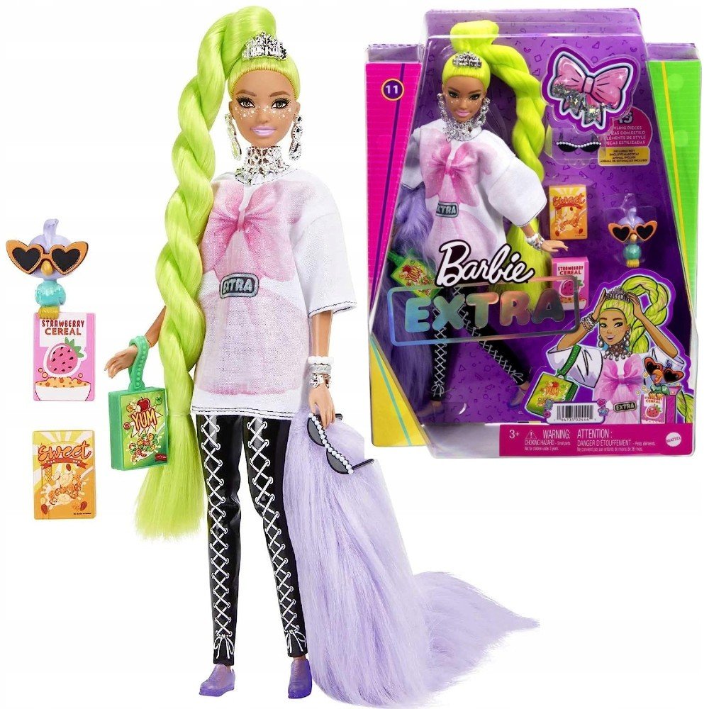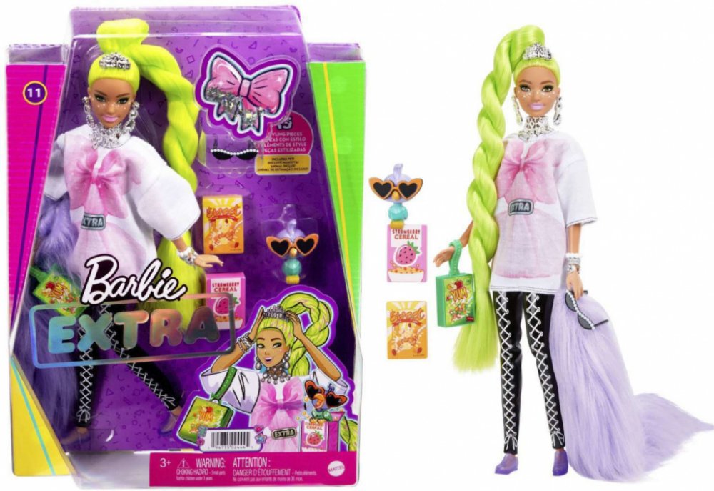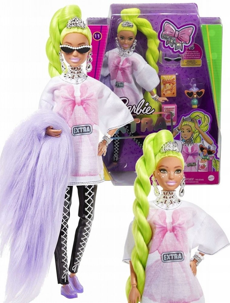 Tato panenka Barbie má make-up s hvězdičkami a extra dlouhé neonově zelené vlasy upravené do efektního stočeného culíku. Svůj sebevědomý styl předvádí v oversize tričku, černých šněrovacích legínách a divokém chlupatém boa. K doplňkům patří zábavná kabelka z krabice od cereálií, sluneční brýle s perlovými detaily, spousta třpytivých šperků a čelenka. Její domácí mazlíček je papoušek v slunečních brýlích ve tvaru srdce a rozkošným výrazem. Barbie Extra umožňuje dětem objevovat sebevyjádření prostřednictvím stylu a kreativity!
