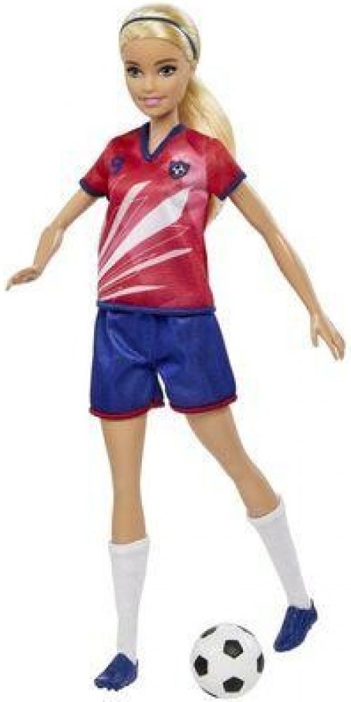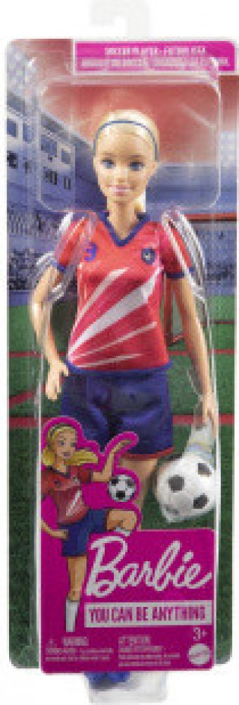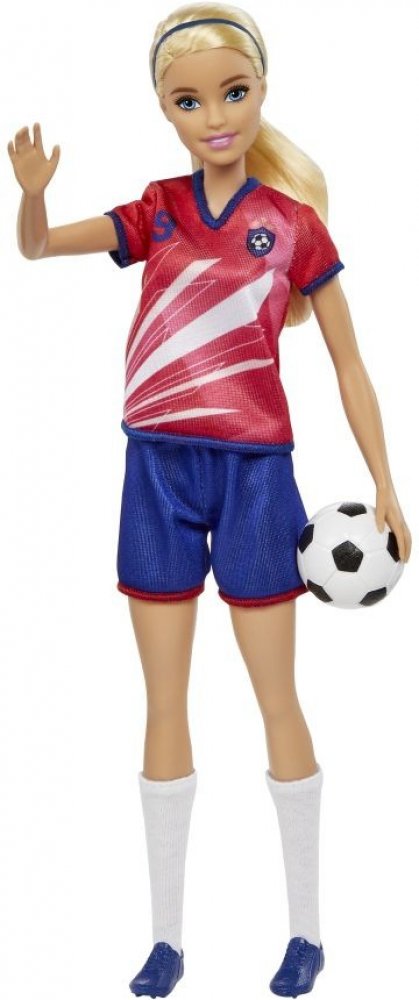 Fotbalová panenka Barbie ve velikosti 29 cm má oblečení inspirované světoznámou barevnou škálou! Panenka Barbie, připravená k boji, má na sobě červený tričko s bílými pruhy, číslem 9 a týmovým nášivkou, stejně jako modré kraťasy, kopačky a vysoké bílé ponožky. Panenka Barbie má také blond copánky a je vybavena fotbalovým doplňkem.