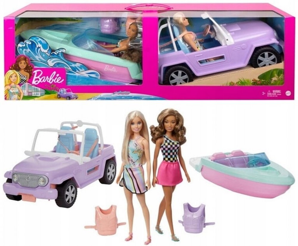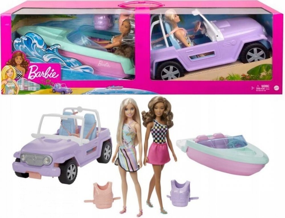 Dvě panenky Barbie v módním oblečení, terénní auto a loďka vznášející se na vodě jsou ideální volbou pro malé cestovatele!