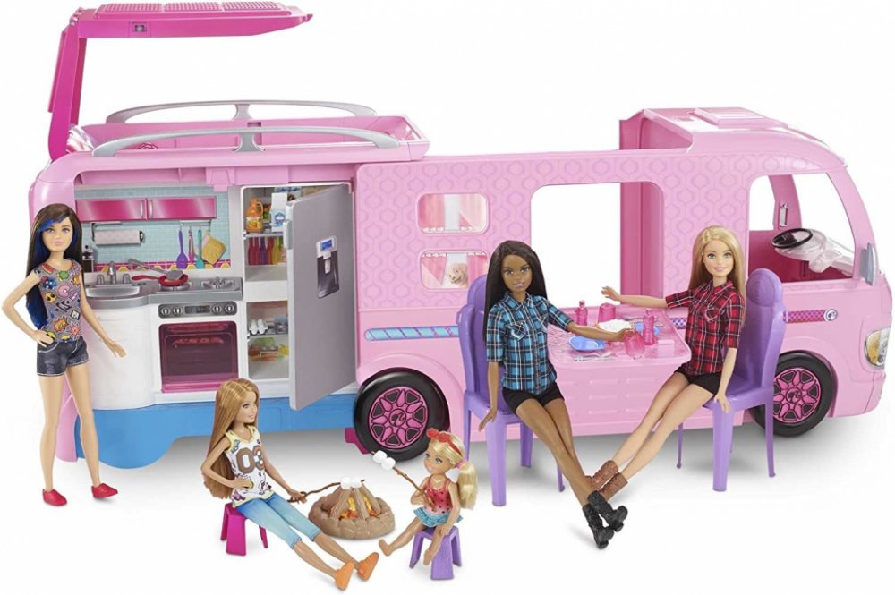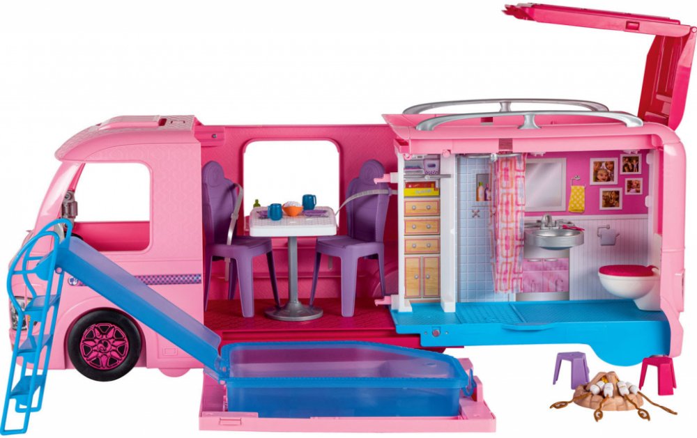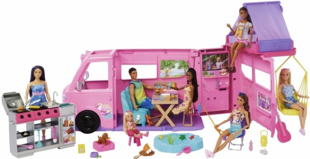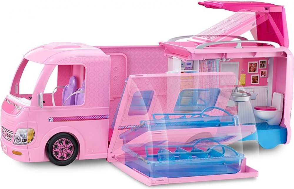 V jednu chvíli je to parádní velký automobil, ale jakmile ho rozložíš, zjistíš, že v sobě ukrývá kempovací sadu s místností, ve které mohou přespat Barbie i všechny její sestry. Karavan je v růžové barvě a kromě zc...