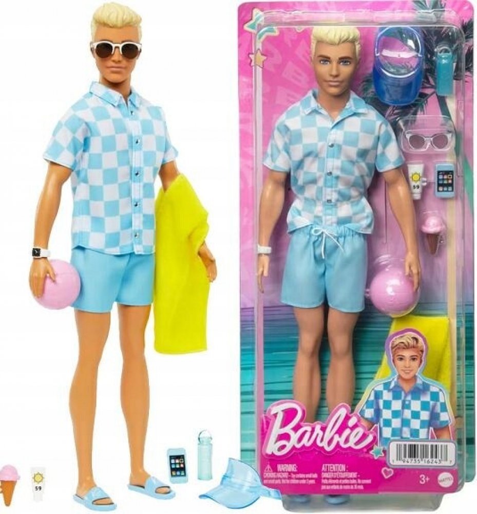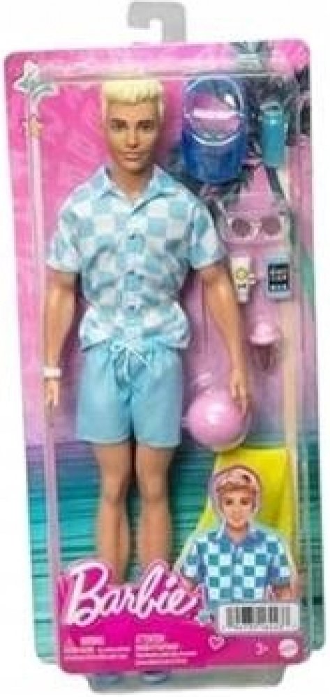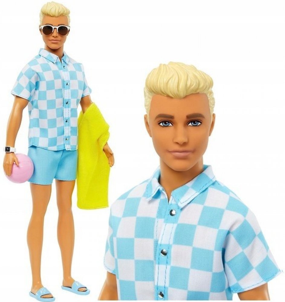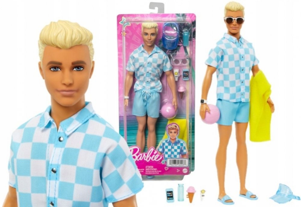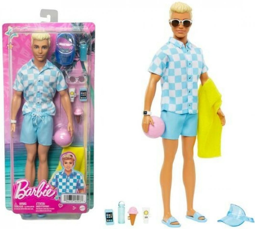 Odpočiňte si na pláži s touto panenkou Barbie Ken! Jeho parádní plavecký obleček a tematické doplňky budou děti inspirovat k vymýšlení všech možných letních příběhů zalitých sluncem. Panenka Ken má na sobě modrobíle kostkované tričko na knoflíky a k němu ladící blankytně modré plavky. Mezi doplňky patří kšiltovka, sluneční brýle, hodinky, ručník, láhev s vodou, opalovací krém a chytrý telefon. Plá...