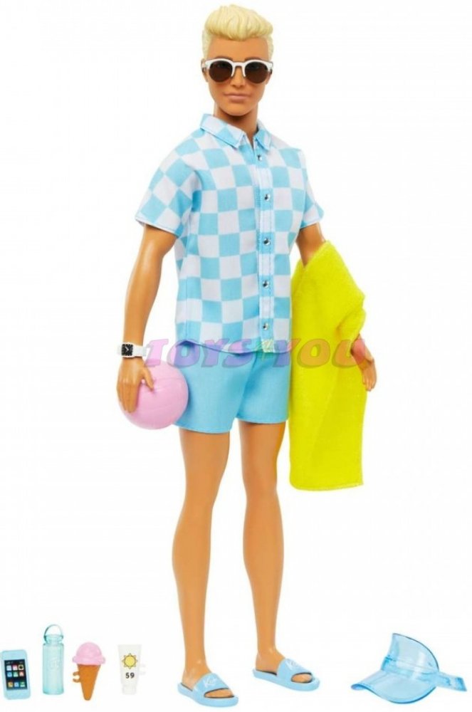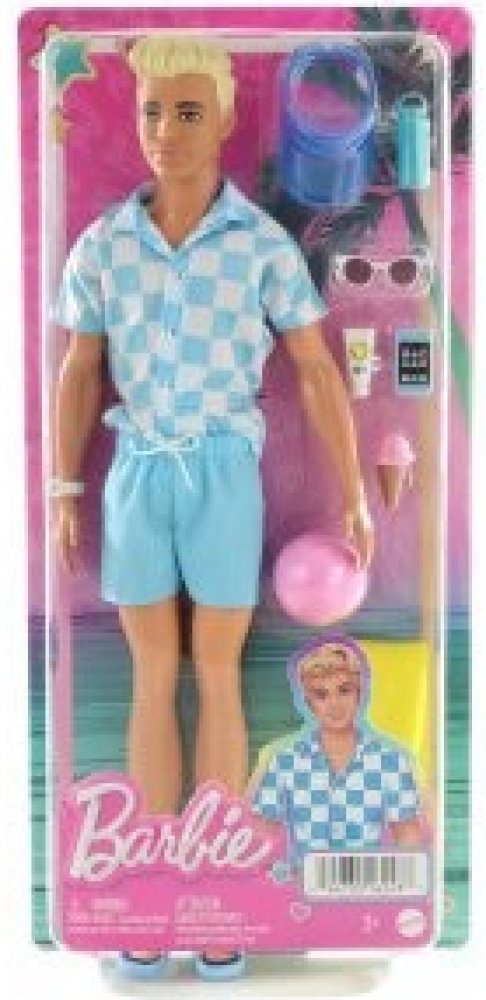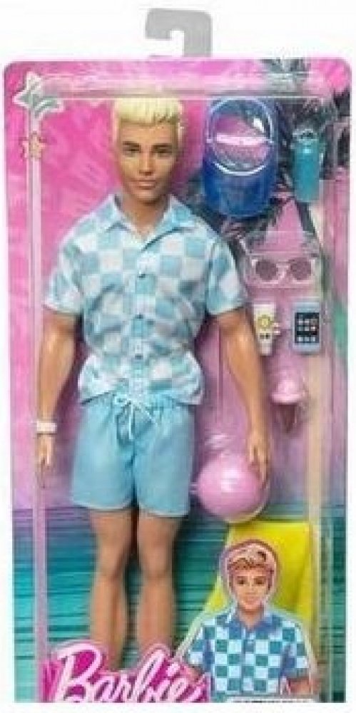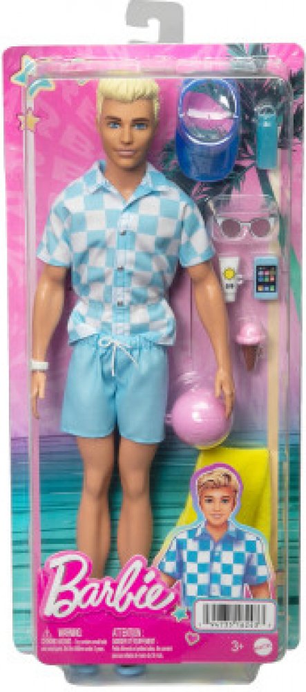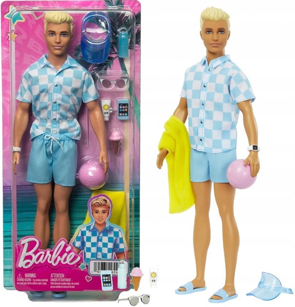 Odpočiňte si na pláži s touto panenkou Barbie Ken! Jeho parádní plavecký obleček a tematické doplňky budou děti inspirovat k vymýšlení všech možných letních příběhů zalitých sluncem. Panenka Ken má na sobě modrobíle kostkované tričko na knoflíky a k němu ladící blankytně modré plavky. Mezi doplňky patří kšiltovka, sluneční brýle, hodinky, ručník, láhev s vodou, opalovací krém a chytrý telefon. Plá...