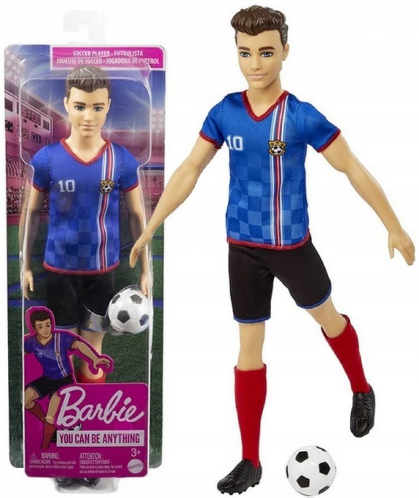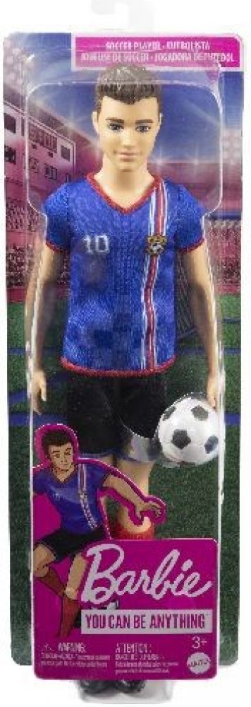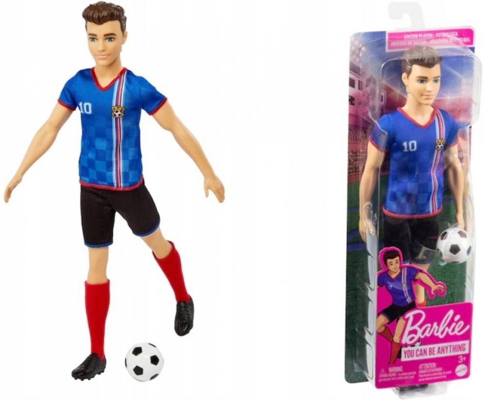 Připrav se na oslavu jednoho z nejoblíbenějších sportů dětí s touto fotbalovou panenkou Barbie Ken! Fotbalová panenka Ken v modrém dresu, který se skládá z modrého trička s pruhem, číslem 10 a týmovou nášivkou, černých šortek, kopaček a vysokých červených ponožek, je inspirována celosvětově oblíbeným barevným provedením. Panenka Ken fotbalista má také nakrátko ostříhané vlasy a dodává se s fotbalovým míčem. Panenka nemůže stát samostatně. Barvy a provedení se mohou lišit.