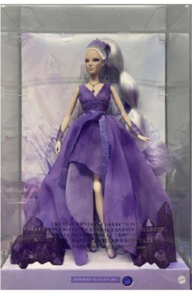 Kolekce krystalů Barbie® Crystal Fantasy Collection ™ je navržena tak, aby odrážela jedinečnou energii a krásu výjimečných kamenů. Ametyst, který je široce uznávaný pro své duchovní a léčivé vlastnosti, ožívá s panenkou Barbie® oblečenou v splývavých šifonových levandulových šatech s lesklou šerpou decentně uvázaným kolem pasu. Vyzařuje čistou energii díky opravdovému náhrdelníku z ametystu, roztříštěným náramkem inspirovaným krystalem a okouzlujícím make-upu. Korunu připomínající shluk úlomků ametystu zdobí její vysoko vyčesaný platinový ocas s jemnými levandulovými odlesky. Když panenka stojí v kouzelné záři, její krystalické boty na podpatku s metalickými šňůrkami ovinut okolo jejích nohou připomínají roztříštěný ametyst. Obal s detaily inspirovanými ametystem a funkcí zářícího světla umožňuje skutečně podmanivé vystavování. Obsahuje stojan na panenku a certifikát pravosti. Panenka nemůže stát sama. Barvy a dekorace se mohou lišit.