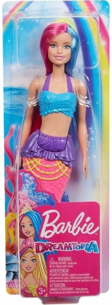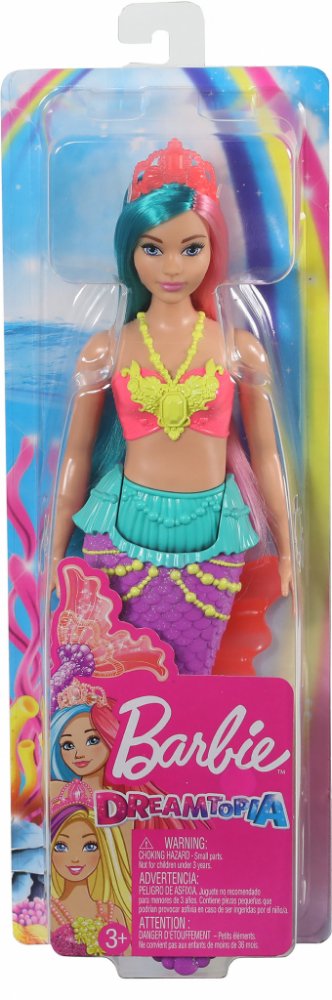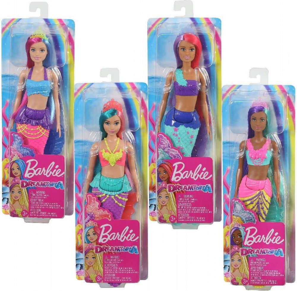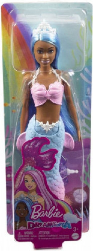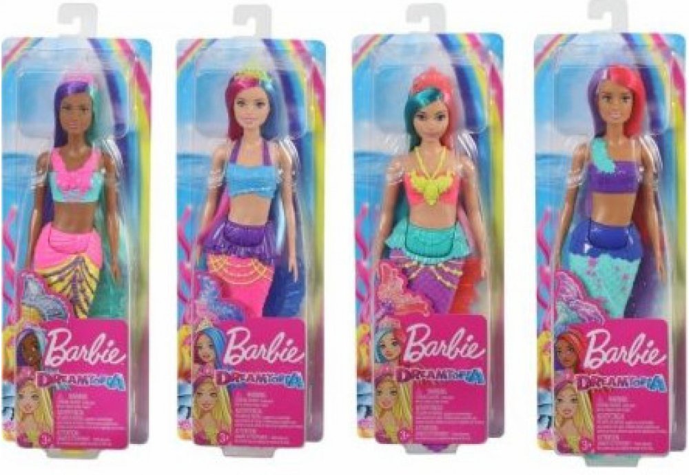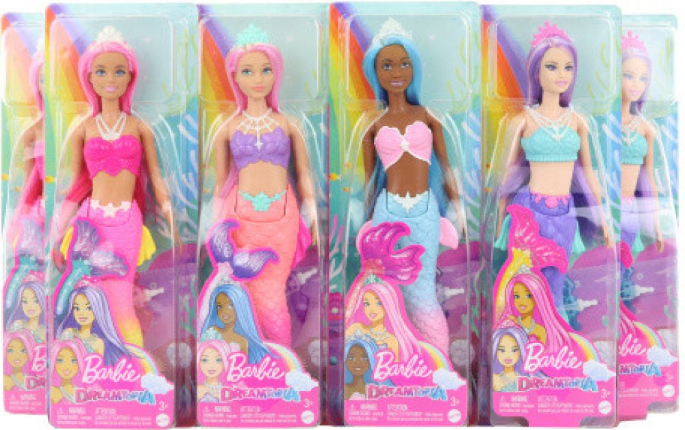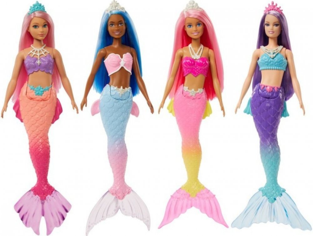 Panenky Barbie™ Kouzelná mořská víla ze světa Dreamtopia rozzáří vyprávění v zářivé fantazii, která se skvěle hodí na královské dobrodružství. Každá panenka mořské víly má pestrou paletu barev, živůtek inspirovaný mušlemi, vícebarevný ombre ocas a průsvitné ploutve. Vlasy a královský diadém dotvářejí vzhled každé panenky inspirovaný mořem. Barbie® Kouzelné mořské víly se ohýbají v pase, takže mohou "plavat" v moři nebo sedět a třpytit se na slunci. Prodávají se samostatně dle aktuální nabídky. Panenky neumí samostatně stát nebo plavat. Barvy a vzhled výrobku se mohou lišit.