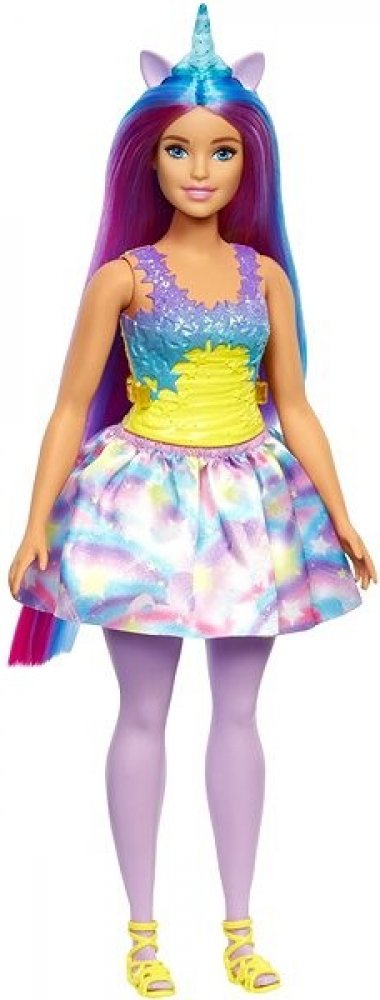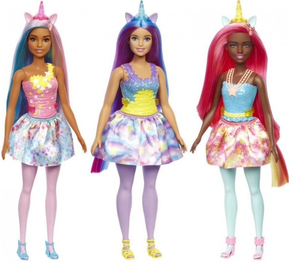 Vstupte do světa magického vyprávění s Barbie Dreamtopia jednorožci! Každá panenka má duhově zářivý vzhled, kompletní s vícebarevnými fantazijními vlasy, bleskovým korzetem a odnímatelnou sukní s nápadně tištěným motivem květin nebo duhy. Díky připevnitelným ocasům a bleskovým jednorožcovým čelenkám s roztomilými ušima si děti mohou proměnit své Barbie panenky na své oblíbené pohádkové stvoření!Ba...
