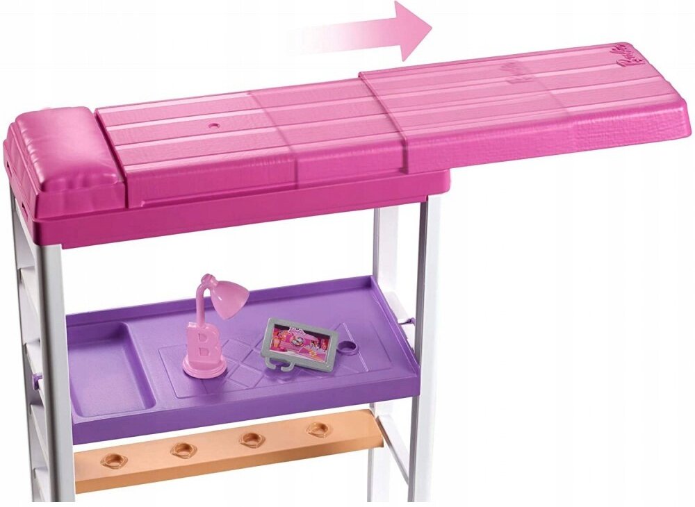 Patrová postel Barbie plní také funkci kanceláře – stačí otočit spodní postel a odhalíte stůl. Přisuňte k němu módní židličku a je hotovo!