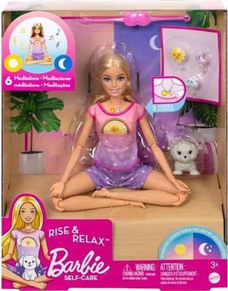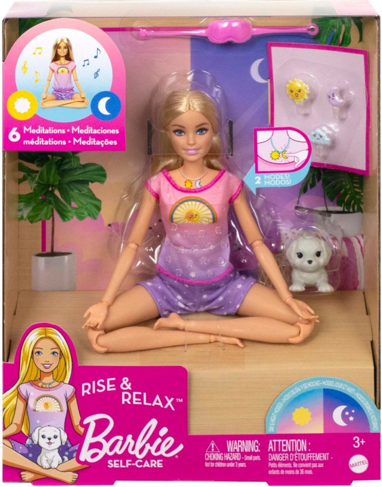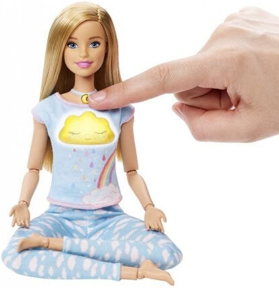 Děti mohou meditovat s panenkou Barbie® Meditace, která jim pomůže cítit se uvolněně během dne a usínat v noci. Tato plně polohovatelná panenka má 6 různých meditací se světelnými a zvukovými obrazci ve 2 různých režimech: Denní a noční. Stiskněte slunce na náhrdelníku panenky Barbie® a postupujte podle něj v režimu Denní pro klidné ranní probuzení, protažení a dechové cvičení. Stiskněte měsíc na náhrdelníku panenky a postupujte podle něj v režimu Noční pro uvolnění svalů, zklidnění před spánkem a usínání. K panence patří také maska na oči, štěňátko a 3 různé zasouvací emotikony, které dětem pomáhají poznávat jejich nálady. Panenka neumí stát samostatně. Barvy a provedení se mohou lišit. Pro děti od 3 let.
