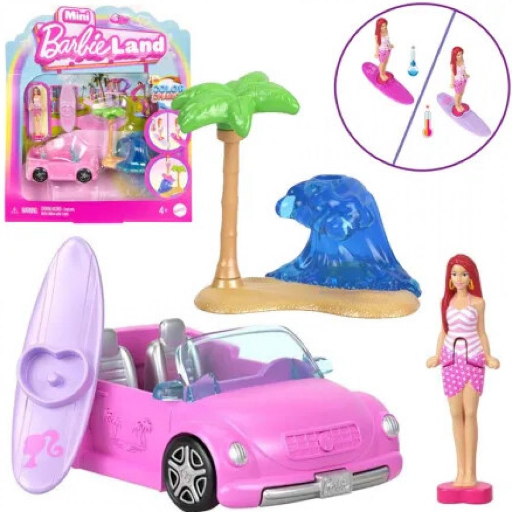 Mini BarbieLand – vstupte do mini světa Barbie s plážovým kabrioletem a bábikou surferkou v zmenšené velikosti.