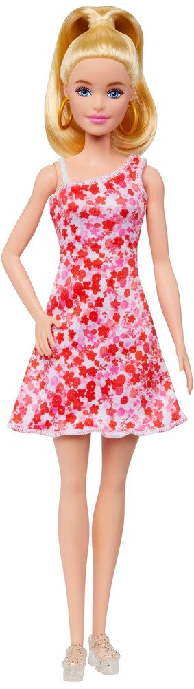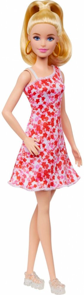 Barbie předvádí další ze svých slušivých modelů. Nová kolekce šatů přináší výběr z široké palety jedinečných kousků. Tentokrát má panenka oblečeny letní šaty na ramínka, střižené nad kolena. Jsou zdobeny jemným květinovým vzorem na světlém podkladu. Její blond vlasy má vyčesané do vysokého copu. Ozdobným doplňkem jsou jí výrazné náušnice. K šatům má boty světlé barvy na platformě. Upozornění: panenka samostatně nestojí není ohebná v loktech a kolenou Potěšte malé slečny Barbie modelkou! Vhodné pro děti od 3 let Materiál obalu: vinyl Výška: 29 cm