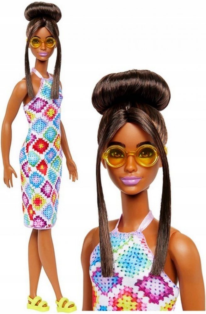 Nová kolekce šatů servíruje širokou paletu jedinečných kousků. Tentokrát má panenka oblečené háčkované šaty střižené těsně pod kolena, ozdobené pestrým geometrickým vzorem. Její dlouhé tmavé vlasy ve dvou pramenech z vyčesaného drdolu splývají pod ramena.