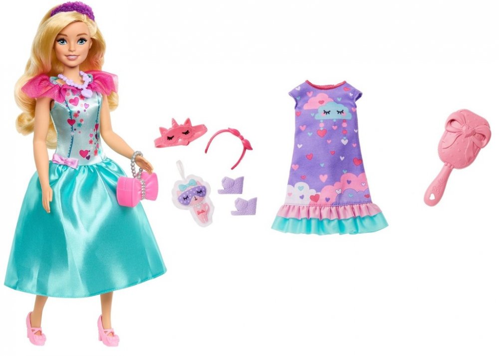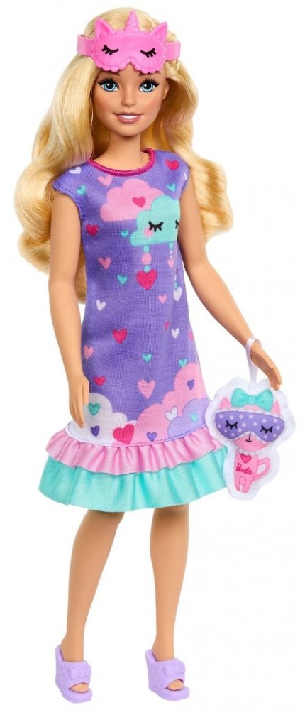 Velké příběhové doplňky, jako jsou ospalá plyšová kočička, čelenka s mašlí, maska na oči s jednorožcem a bačkůrky na podpatku, doplňují panenčinu noční košilku a inspirují k příjemným a láskyplným chvilkám před spaním.