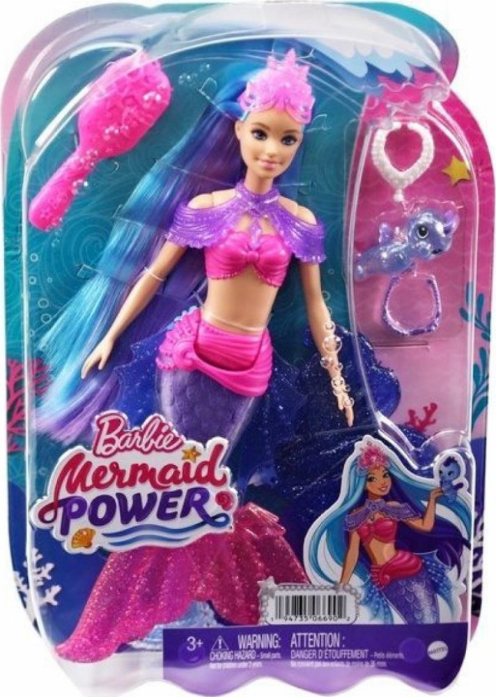 Vyměnitelné ploutve, různé doplňky ke šperkům, kartáč na vlasy a mazlíček inspirují zábavu při vyprávění příběhů a stylingu. Panenky neumí samostatně stát nebo plavat.