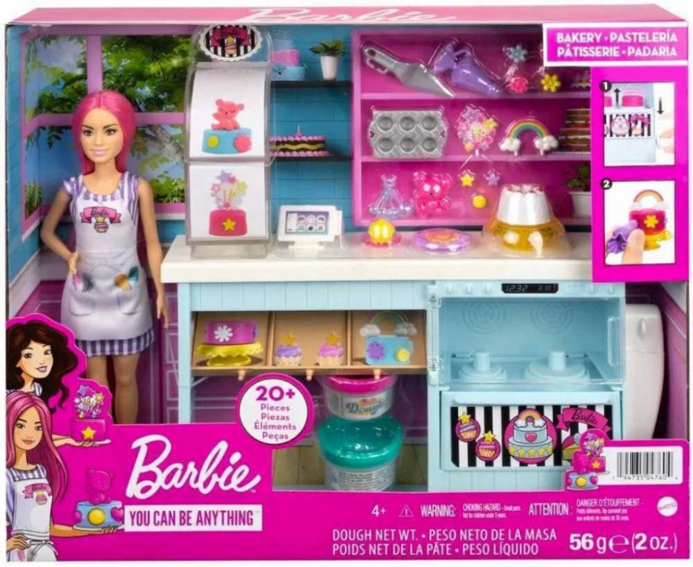 Herní set obsahuje panenku Barbie® pekařku vysokou 30 cm s parádními růžovými vlasy a v roztomilých pruhovaných šatech. Pekařská stanice má tři hrací plochy na pečení, zdobení a vystavování a navíc se dodává s více než 15 doplňky. Děti mohou použít dva druhy těsta (růžové nebo modré) a vložit je do trouby, zatáhnout za páku a sledovat, jak koláče vykynou! Poté mohou pomocí razítkovače ozdobit dort na podstavci a použít také příslušenství na zdobení dortů!