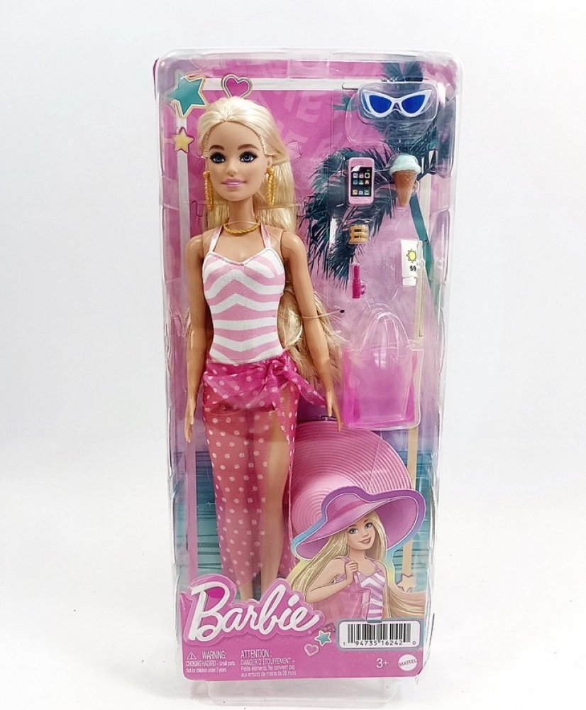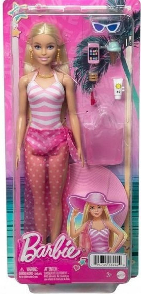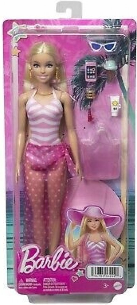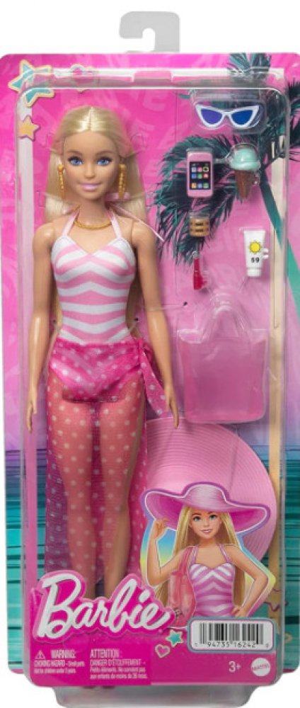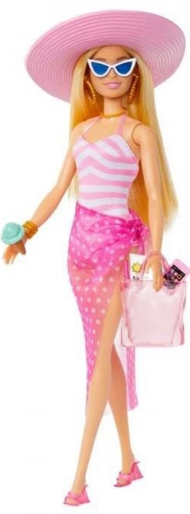 Panenka Barbie má na sobě růžové a bílé pruhované plavky a kolem pasu má uvázaný průhledný puntíkovaný sarong. Zlaté náušnice a sandály s otevřenou špičkou dodávají vzhledu zvláštní záři.