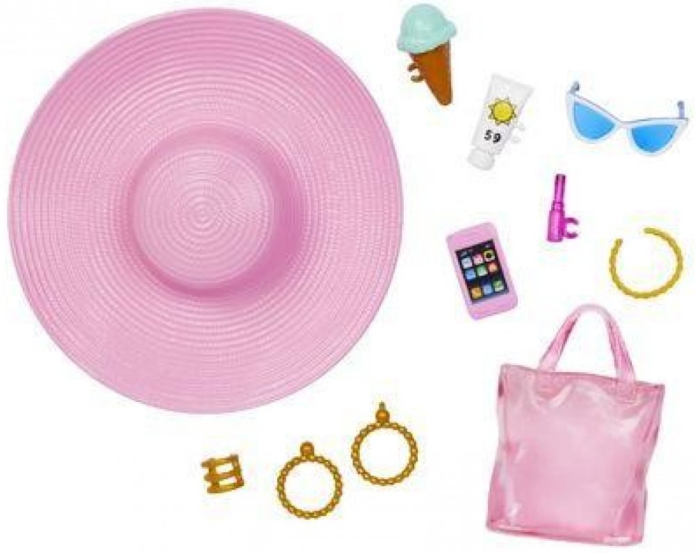 Stylové doplňky zahrnují klobouk se širokou krempou, kočičí sluneční brýle, zlatý náhrdelník a náramek. Růžové pouzdro je ideální pro uložení opalovacího krému, rtěnky a smartphonu. Pro realistické pózy můžete na ruku připevnit kornout zmrzliny s mátovou příchutí.