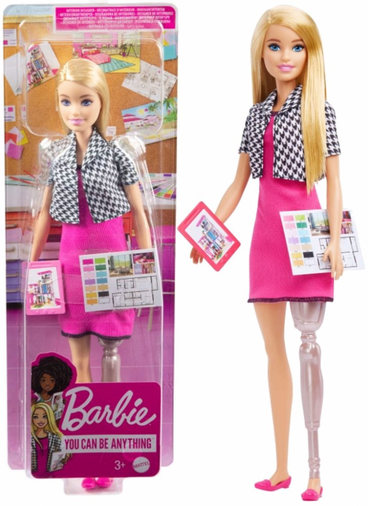 Panenka Barbie návrhářka interiérů má protetickou nohu, tablet a desku s návrhy.